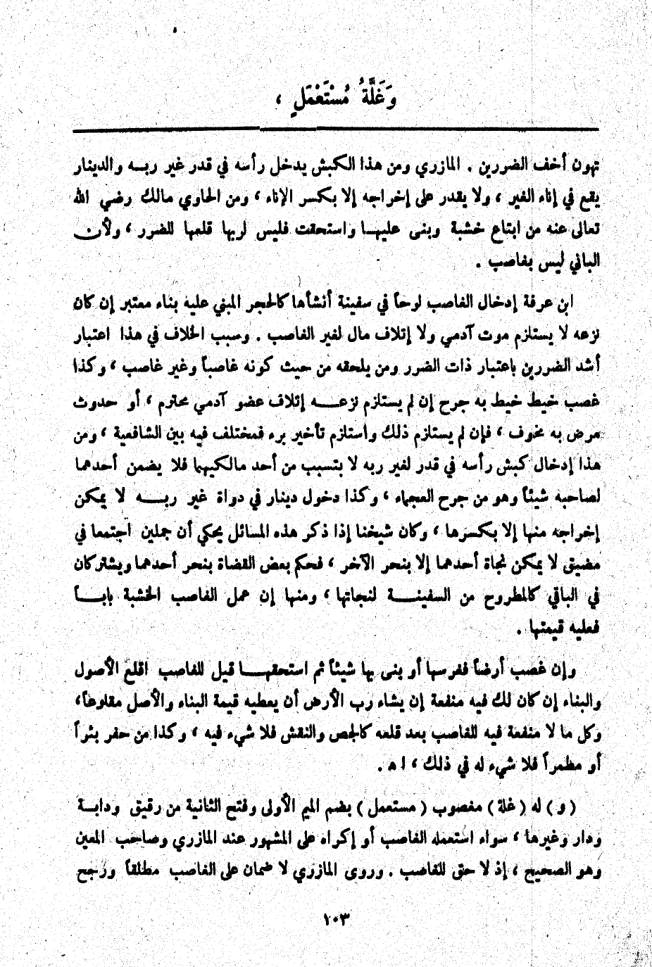 (وَ) لَهُ (غَلَّةُ) مَغْصُوبٍ (مُسْتَعْمَلٍ) بِضَمِّ الْمِيمِ الْأُولَى وَفَتْحِ الثَّانِيَةِ مِنْ رَقِيقٍ وَدَابَّةٍ وَدَارٍ وَغَيْرِهَا، سَوَاءٌ اسْتَعْمَلَهُ الْغَاصِبُ أَوْ أَكْرَاهُ عَلَى الْمَشْهُورِ عِنْدَ الْمَازِرِيِّ وَصَاحِبِ الْمُعِينِ وَهُوَ الصَّحِيحُ إذْ لَا حَقَّ لِلْغَاصِبِ. وَرَوَى الْمَازِرِيُّ لَا ضَمَانَ عَلَى الْغَاصِبِ مُطْلَقًا وَرُجِّحَ