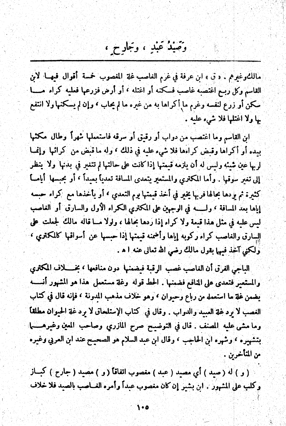 (وَ) لَهُ (صَيْدُ) أَيْ مَصِيدُ (عَبْدٍ) مَغْصُوبٍ اتِّفَاقًا (وَ) مَصِيدُ (جَارِحٍ) كَبَازٍ وَكَلْبٍ عَلَى الْمَشْهُورِ. ابْنُ بَشِيرٍ إنْ كَانَ الْمَغْصُوبُ عَبْدًا وَأَمَرَهُ الْغَاصِبُ بِالصَّيْدِ فَلَا خِلَافَ