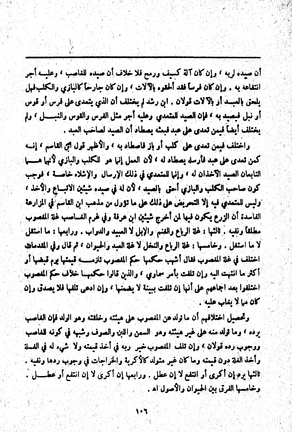 ـــــــــــــــــــــــــــــQأَنَّ صَيْدَهُ لِرَبِّهِ، وَإِنْ كَانَ آلَةً كَسَيْفٍ وَرُمْحٍ فَلَا خِلَافَ أَنَّ صَيْدَهُ لِلْغَاصِبِ، وَعَلَيْهِ أَجْرُ انْتِفَاعِهِ بِهِ. وَإِنْ كَانَ فَرَسًا فَقَدْ أَلْحَقُوهُ بِالْآلَاتِ، وَإِنْ كَانَ جَارِحًا كَالْبَازِي وَالْكَلْبِ فَهَلْ يُلْحَقُ بِالْعَبْدِ أَوْ بِالْآلَاتِ قَوْلَانِ. ابْنُ رُشْدٍ لَمْ يُخْتَلَفْ أَنَّ الَّذِي يَتَعَدَّى عَلَى فَرَسٍ أَوْ قَوْسٍ أَوْ نَبْلٍ فَيَصِيدُ بِهِ، فَإِنَّ الصَّيْدَ لِلْمُتَعَدِّي وَعَلَيْهِ أَجْرُ مِثْلِ الْفَرَسِ وَالْقَوْسِ وَالنَّبْلِ، وَلَمْ يُخْتَلَفْ أَيْضًا فِيمَنْ تَعَدَّى عَلَى عَبْدٍ فَبَعَثَهُ يَصْطَادُ أَنَّ الصَّيْدَ لِصَاحِبِ الْعَبْدِ. وَاخْتُلِفَ فِيمَنْ تَعَدَّى عَلَى كَلْبٍ أَوْ بَازٍ فَاصْطَادَ بِهِ وَالْأَظْهَرُ قَوْلُ ابْنِ الْقَاسِمِ، أَنَّهُ كَمَنْ تَعَدَّى عَلَى عَبْدٍ فَأَرْسَلَهُ يَصْطَادُ لَهُ، لِأَنَّ الْعَمَلَ إنَّمَا هُوَ لِلْكَلْبِ وَالْبَازِي لِأَنَّهُمَا هُمَا التَّابِعَانِ الصَّيْدَ الْآخِذَانِ لَهُ، وَإِنَّمَا لِلْمُتَعَدِّي فِي ذَلِكَ الْإِرْسَالُ وَالْإِشْلَاءُ خَاصَّةً، فَوَجَبَ كَوْنُ صَاحِبِ الْكَلْبِ وَالْبَازِي أَحَقَّ بِالصَّيْدِ لِأَنَّ لَهُ فِي صَيْدِهِ شَيْئَيْنِ الِاتِّبَاعَ وَالْأَخْذَ، وَلَيْسَ لِلْمُتَعَدِّي فِيهِ إلَّا التَّحْرِيضُ عَلَى ذَلِكَ عَلَى مَا تُؤُوِّلَ مِنْ مَذْهَبِ ابْنُ الْقَاسِمِ فِي الْمُزَارَعَةِ الْفَاسِدَةِ أَنَّ الزَّرْعَ يَكُونُ فِيهَا لِمَنْ أَخْرَجَ شَيْئَيْنِ ابْنُ عَرَفَةَ وَفِي غُرْمِ الْغَاصِبِ غَلَّةَ الْمَغْصُوبِ مُطْلَقًا وَنَفْيِهِ، ثَالِثُهَا: غَلَّةُ الرِّبَاعِ وَالْغَنَمِ وَالْإِبِلِ لَا الْعَبِيدِ وَالدَّوَابِّ، وَرَابِعُهَا: مَا اسْتَقَلَّ لَا مَا اُسْتُغِلَّ. وَخَامِسُهَا: غَلَّةُ الرِّبَاعِ وَالنَّخْلِ لَا غَلَّةُ الْعَبْدِ وَالْحَيَوَانِ، ثُمَّ قَالَ وَفِي الْمُقَدِّمَاتِ اُخْتُلِفَ فِي غَلَّةِ الْمَغْصُوبِ فَقَالَ أَشْهَبُ حُكْمُهَا حُكْمُ الْمَغْصُوبِ تَلْزَمُهُ قِيمَتُهَا يَوْمَ قَبْضِهَا أَوْ أَكْثَرُ مَا انْتَهَتْ إلَيْهِ وَإِنْ تَلِفَتْ بِأَمْرٍ سَمَاوِيٍّ، وَاَلَّذِينَ قَالُوا حُكْمُهَا خِلَافُ حُكْمِ الْمَغْصُوبِ اخْتَلَفُوا بَعْدَ إجْمَاعِهِمْ عَلَى أَنَّهَا إنْ تَلِفَتْ بِبَيِّنَةٍ لَا يَضْمَنُهَا، وَإِنْ ادَّعَى تَلَفَهَا فَلَا يُصَدَّقُ وَإِنْ كَانَ مِمَّا لَا يُغَابُ عَلَيْهِ. وَتَحْصِيلُ اخْتِلَافِهِمْ أَنَّ مَا تَوَلَّدَ عَنْ الْمَغْصُوبِ عَلَى هَيْئَتِهِ وَخِلْقَتِهِ وَهُوَ الْوَلَدُ فَإِنَّ الْغَاصِبَ يَرُدُّهُ، وَمَا تَوَلَّدَ مِنْهُ عَلَى غَيْرِ هَيْئَتِهِ وَهُوَ السَّمْنُ وَاللَّبَنُ وَالصُّوفُ وَشِبْهُهُ فِي كَوْنِهِ لِلْغَاصِبِ وَوُجُوبِ رَدِّهِ قَوْلَانِ وَإِنْ تَلِفَ الْمَغْصُوبُ خُيِّرَ رَبُّهُ فِي أَخْذِ قِيمَتِهِ وَلَا شَيْءَ لَهُ فِي الْغَلَّةِ وَأَخْذِ الْغَلَّةِ دُونَ قِيمَتِهِ، وَمَا كَانَ غَيْرُ مُتَوَلِّدٍ كَالْأَكْرِيَةِ وَالْخَرَاجَاتِ فِي وُجُوبِ رَدِّهَا وَنَفْيِهِ.