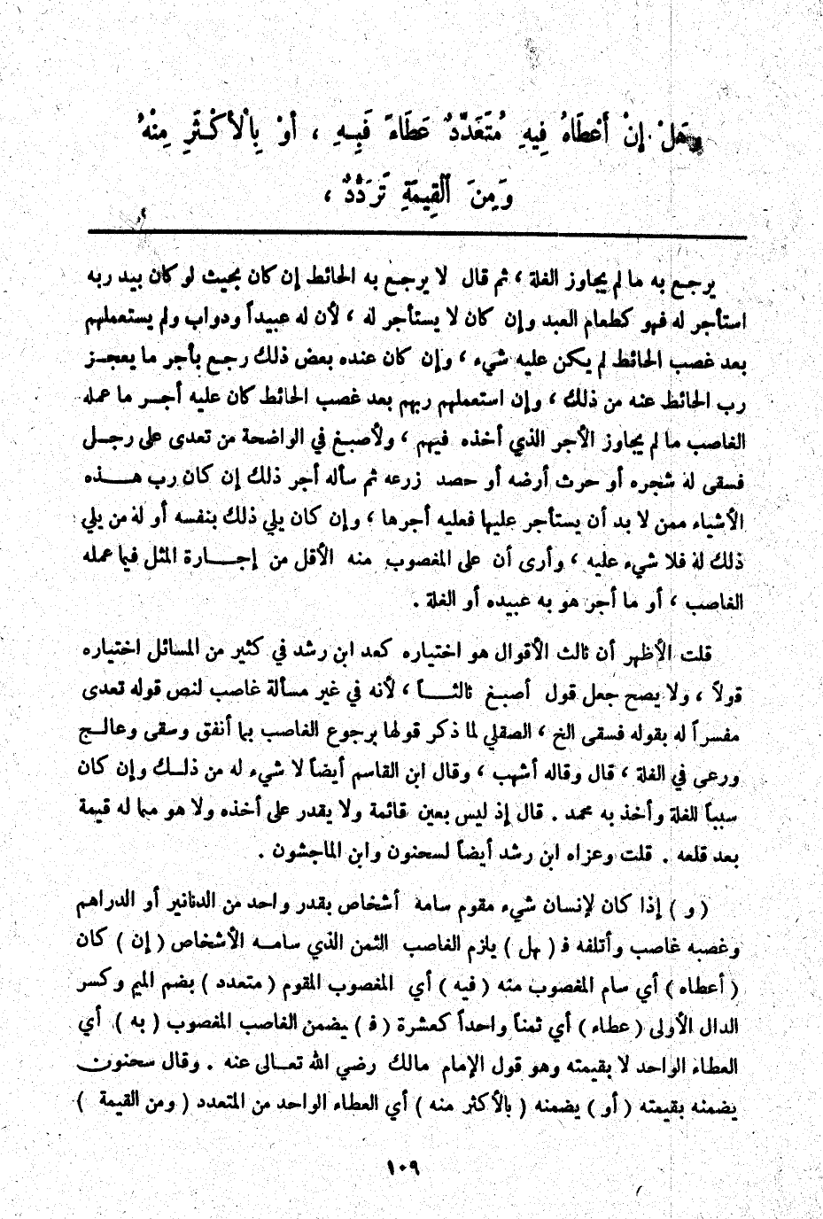(وَ) إذَا كَانَ لِإِنْسَانٍ شَيْءٌ مُقَوَّمٌ سَامَهُ أَشْخَاصٌ بِقَدْرٍ وَاحِدٍ مِنْ الدَّنَانِيرِ أَوْ الدَّرَاهِمِ وَغَصَبَهُ غَاصِبٌ وَأَتْلَفَهُ فَ (هَلْ) يَلْزَمُ الْغَاصِبَ الثَّمَنُ الَّذِي سَامَهُ الْأَشْخَاصُ (إنْ) كَانَ (أَعْطَاهُ) أَيْ سَامَ الْمَغْصُوبَ مِنْهُ (فِيهِ) أَيْ الْمَغْصُوبِ الْمُقَوَّمِ (مُتَعَدِّدٌ) بِضَمِّ الْمِيمِ وَكَسْرِ الدَّالِ الْأُولَى (عَطَاءً) أَيْ ثَمَنًا وَاحِدًا كَعَشَرَةٍ (فَ) يَضْمَنُ الْغَاصِبُ الْمَغْصُوبَ (بِهِ) أَيْ الْعَطَاءِ الْوَاحِدِ لَا بِقِيمَتِهِ وَهُوَ قَوْلُ الْإِمَامِ مَالِكٍ - رَضِيَ اللَّهُ تَعَالَى عَنْهُ -. وَقَالَ سَحْنُونٌ يَضْمَنُهُ بِقِيمَتِهِ (أَوْ) يَضْمَنُهُ (بِالْأَكْثَرِ مِنْهُ) أَيْ الْعَطَاءِ الْوَاحِدِ مِنْ الْمُتَعَدِّدِ (وَمِنْ الْقِيمَةِ)
