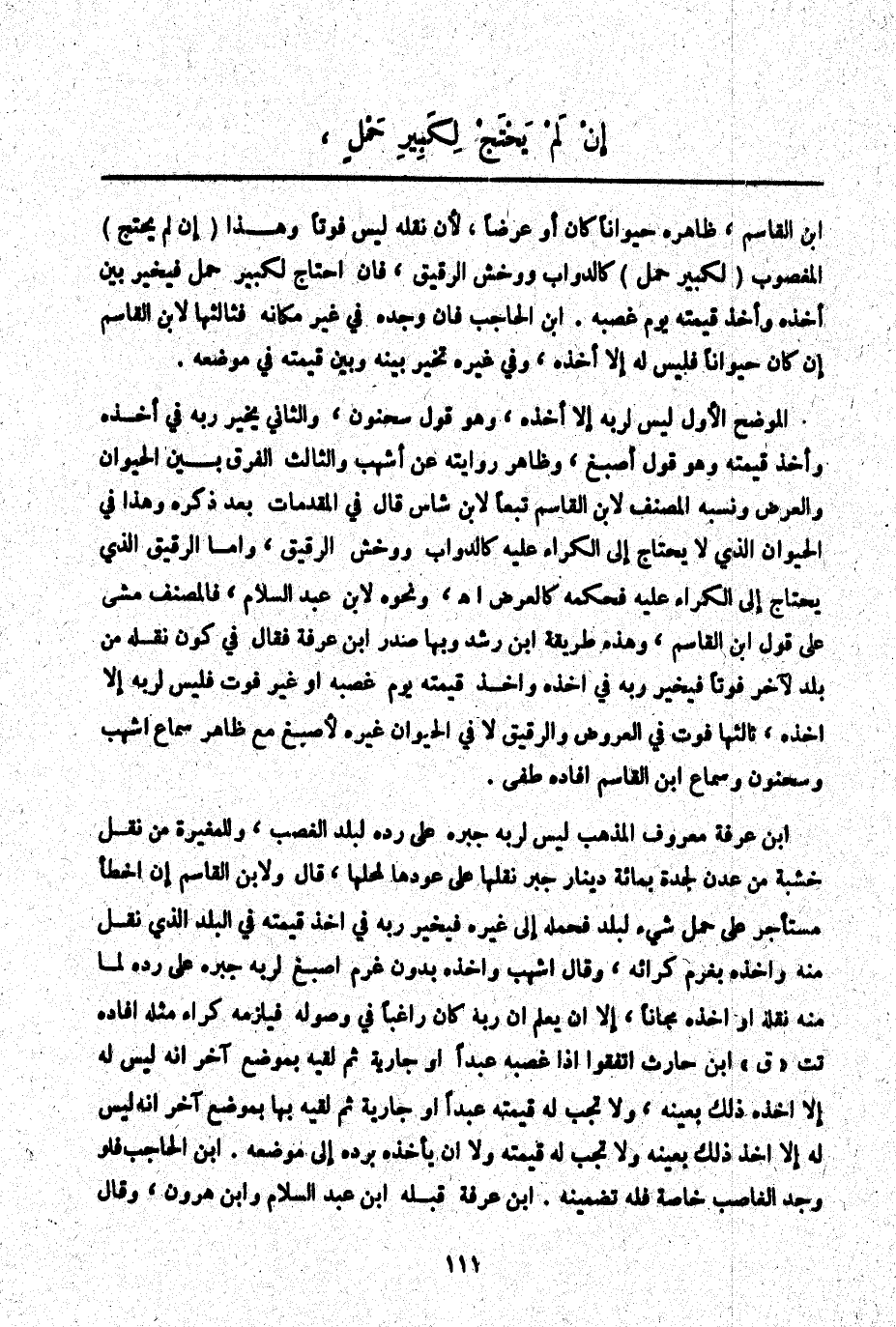 ـــــــــــــــــــــــــــــQابْنُ الْقَاسِمِ، ظَاهِرُهُ حَيَوَانًا كَانَ أَوْ عَرْضًا لِأَنَّ نَقْلَهُ لَيْسَ فَوْتًا وَهَذَا (إنْ لَمْ يَحْتَجْ) الْمَغْصُوبُ (لِكَبِيرِ حَمْلٍ) كَالدَّوَابِّ وَوَخْشِ الرَّقِيقِ، فَإِنْ احْتَاجَ لِكَبِيرِ حَمْلٍ فَيُخَيَّرُ بَيْنَ أَخْذِهِ وَأَخْذِ قِيمَتِهِ يَوْمَ غَصْبِهِ. ابْنُ الْحَاجِبِ فَإِنْ وَجَدَهُ فِي غَيْرِ مَكَانِهِ فَثَالِثُهَا لِابْنِ الْقَاسِمِ إنْ كَانَ حَيَوَانًا فَلَيْسَ لَهُ إلَّا أَخْذُهُ، وَفِي غَيْرِهِ تَخَيَّرَ بَيْنَهُ وَبَيْنَ قِيمَتِهِ فِي مَوْضِعِهِ. الْمُوَضَّحُ الْأَوَّلُ لَيْسَ لِرَبِّهِ إلَّا أَخْذُهُ، وَهُوَ قَوْلُ سَحْنُونٍ، وَالثَّانِي يُخَيَّرُ رَبُّهُ فِي أَخْذِهِ وَأَخْذِ قِيمَتِهِ وَهُوَ قَوْلُ أَصْبَغَ وَظَاهِرُ رِوَايَتِهِ عَنْ أَشْهَبَ وَالثَّالِثُ الْفَرْقُ بَيْنَ الْحَيَوَانِ وَالْعَرْضِ وَنَسَبَهُ الْمُصَنِّفُ لِابْنِ الْقَاسِمِ تَبَعًا لِابْنِ شَاسٍ قَالَ فِي الْمُقَدِّمَاتِ بَعْدَ ذِكْرِهِ وَهَذَا فِي الْحَيَوَانِ الَّذِي لَا يَحْتَاجُ إلَى الْكِرَاءِ عَلَيْهِ كَالدَّوَابِّ وَوَخْشِ الرَّقِيقِ، وَأَمَّا الرَّقِيقُ الَّذِي يَحْتَاجُ إلَى الْكِرَاءِ عَلَيْهِ فَحُكْمُهُ كَالْعَرْضِ. اهـ. وَنَحْوُهُ لِابْنِ عَبْدِ السَّلَامِ، فَالْمُصَنِّفُ مَشَى عَلَى قَوْلِ ابْنِ الْقَاسِمِ، وَهَذِهِ طَرِيقَةُ ابْنِ رُشْدٍ وَبِهَا صَدَّرَ ابْنُ عَرَفَةَ فَقَالَ فِي كَوْنِ نَقْلِهِ مِنْ بَلَدٍ لِآخَرَ فَوْتًا فَيُخَيَّرُ رَبُّهُ فِي أَخْذِهِ وَأَخْذِ قِيمَتِهِ يَوْمَ غَصْبِهِ أَوْ غَيْرَ فَوْتٍ فَلَيْسَ لِرَبِّهِ إلَّا أَخْذُهُ، ثَالِثُهَا فَوْتٌ فِي الْعُرُوضِ وَالرَّقِيقِ لَا فِي الْحَيَوَانِ غَيْرُهُ لِأَصْبَغَ ظَاهِرُ سَمَاعِ أَشْهَبَ وَسَحْنُونٍ وَسَمَاعِ ابْنِ الْقَاسِمِ أَفَادَهُ طفي.