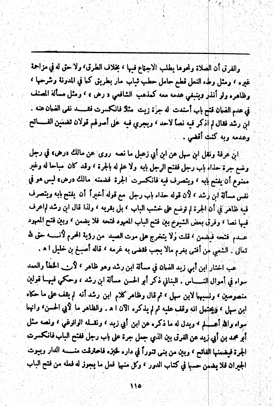 عب اخْتَارَ ابْنُ أَبِي زَيْدٍ الضَّمَانَ فِي مَسْأَلَةِ ابْنِ رُشْدٍ وَهُوَ ظَاهِرٌ لِأَنَّ الْخَطَأَ وَالْعَمْدَ سَوَاءٌ فِي أَمْوَالِ النَّاسِ. الْبُنَانِيُّ ذَكَرَ أَبُو الْحَسَنِ مَسْأَلَةِ ابْنِ رُشْدٍ، وَحَكَى فِيهَا قَوْلَيْنِ مَنْصُوصَيْنِ، وَنَسَبَهُمَا لِابْنِ سَهْلٍ، ثُمَّ قَالَ وَظَاهِرُ كَلَامِ ابْنِ رُشْدٍ أَنَّهُ لَمْ يَقِفْ عَلَى مَا حَكَاهُ ابْنُ سَهْلٍ، وَيُحْتَمَلُ أَنَّهُ وَقَفَ عَلَيْهِ ثُمَّ لَمْ يَذْكُرْهُ الْآنَ اهـ. وَالظَّاهِرُ مَا لِأَبِي الْحَسَنِ، وَأَنَّهُمَا سَوَاءٌ وَاَللَّهُ أَعْلَمُ، وَيَدُلُّ لَهُ مَا ذَكَرَهُ عَنْ ابْنِ أَبِي زَيْدٍ، وَنَقَلَهُ الْوَانُّوغِيُّ، وَنَصُّهُ سُئِلَ أَبُو مُحَمَّدِ بْنِ أَبِي زَيْدٍ عَنْ الْفَرْقِ بَيْنَ الَّذِي جَعَلَ جَرَّةً عَلَى بَابِ رَجُلٍ فَفَتَحَ الْبَابَ فَانْكَسَرَتْ الْجَرَّةُ فَيَضْمَنُهَا الْفَاتِحُ، وَبَيْنَ مَنْ بَنَى تَنُّورًا فِي دَارِهِ لِخَبْزِهِ فَاحْتَرَقَتْ مِنْهُ الدَّارُ وَبُيُوتُ الْجِيرَانِ فَلَا يَضْمَنُ حَسْبَمَا فِي كِتَابِ الدُّورِ، وَكُلٌّ مِنْهُمَا فَعَلَ مَا يَجُوزُ لَهُ فِعْلُهُ مِنْ فَتْحِ الْبَابِ