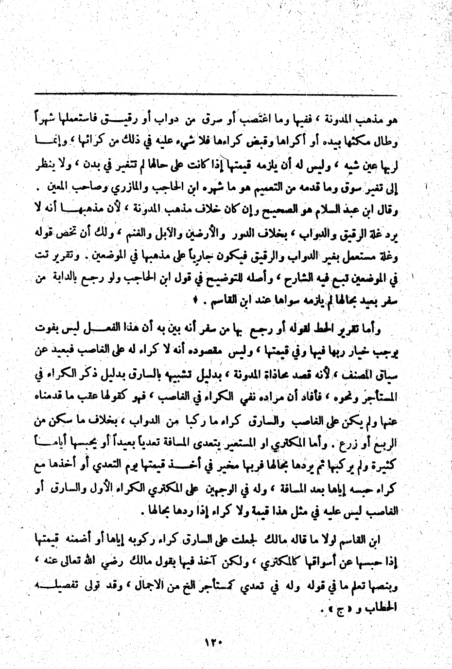 ابْنُ الْقَاسِمِ لَوْلَا مَا قَالَهُ مَالِكٌ لَجَعَلَتْ عَلَى السَّارِقِ كِرَاءَ رُكُوبِهِ إيَّاهَا أَوْ أُضَمِّنُهُ قِيمَتَهَا إذَا حَبَسَهَا عَنْ أَسْوَاقِهَا كَالْمُكْتَرِي، وَلَكِنْ آخُذُ فِيهَا بِقَوْلِ مَالِكٍ - رَضِيَ اللَّهُ تَعَالَى عَنْهُ -، وَبِنَصِّهَا تَعْلَمُ مَا فِي قَوْلِهِ وَلَهُ فِي تَعَدِّي كَمُسْتَأْجِرٍ إلَخْ مِنْ الْإِجْمَالِ، وَقَدْ تَوَلَّى تَفْصِيلَهُ الْحَطَّابُ وَ " ج ".