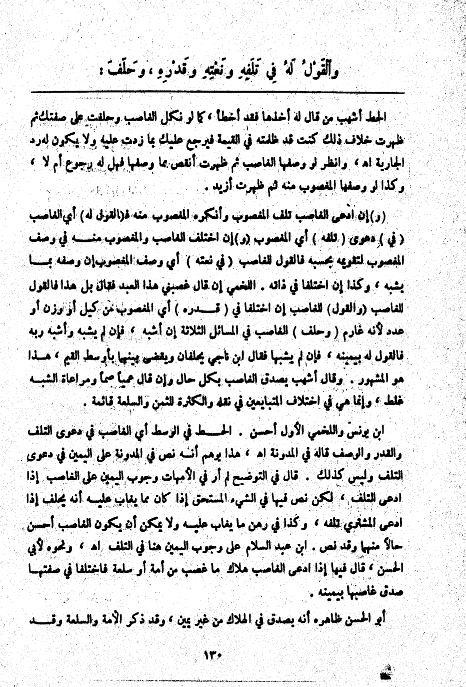(وَ) إنْ ادَّعَى الْغَاصِبُ تَلَفَ الْمَغْصُوبِ وَأَنْكَرَهُ الْمَغْصُوبُ مِنْهُ فَ (الْقَوْلُ لَهُ) أَيْ الْغَاصِبِ (فِي) دَعْوَى (تَلَفِهِ) أَيْ الْمَغْصُوبِ (وَ) إنْ اخْتَلَفَ الْغَاصِبُ وَالْمَغْصُوبُ مِنْهُ فِي وَصْفِ الْمَغْصُوبِ لِتَقْوِيمِهِ بِحَسَبِهِ فَالْقَوْلُ لِلْغَاصِبِ (فِي نَعْتِهِ) أَيْ وَصْفِ الْمَغْصُوبِ إنْ وَصَفَهُ بِمَا يُشْبِهُ، وَكَذَا إنْ اخْتَلَفَا فِي ذَاتِهِ. اللَّخْمِيُّ إنْ قَالَ غَصَبَنِي هَذَا الْعَبْدَ فَقَالَ بَلْ هَذَا فَالْقَوْلُ لِلْغَاصِبِ (وَالْقَوْلُ) لِلْغَاصِبِ إنْ اخْتَلَفَا فِي (قَدْرِهِ) أَيْ الْمَغْصُوبِ مِنْ كَيْلٍ أَوْ وَزْنٍ أَوْ عَدَدٍ لِأَنَّهُ غَارِمٌ (وَحَلَفَ) الْغَاصِبُ فِي الْمَسَائِلِ الثَّلَاثَةِ إنْ أَشْبَهَ، فَإِنْ لَمْ يُشْبِهْ وَأَشْبَهَ رَبُّهُ فَالْقَوْلُ لَهُ بِيَمِينِهِ، فَإِنْ لَمْ يُشْبِهَا فَقَالَ ابْنُ نَاجِي يَحْلِفَانِ وَيُقْضَى بَيْنَهُمَا بِأَوْسَطِ الْقِيَمِ، هَذَا هُوَ الْمَشْهُورُ. وَقَالَ أَشْهَبُ يُصَدَّقُ الْغَاصِبُ بِكُلِّ حَالٍ وَإِنْ قَالَ عُمْيًا صُمًّا وَمُرَاعَاةُ الشَّبَهِ غَلَطٌ، وَإِنَّمَا هُمْ فِي اخْتِلَافِ الْمُتَبَايِعَيْنِ فِي نَقْلِهِ وَالْكَثْرَةُ لِلثَّمَنِ وَالسِّلْعَةُ قَائِمَةٌ.