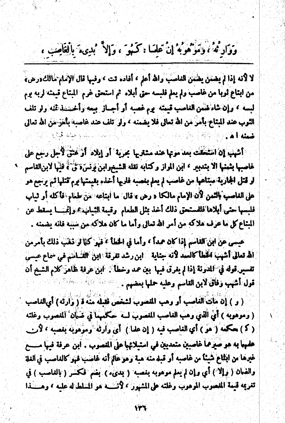 (وَ) إنْ مَاتَ الْغَاصِبُ أَوْ وَهَبَ الْمَغْصُوبَ لِشَخْصٍ فَقَبِلَهُ مِنْهُ فَ (وَارِثُهُ) أَيْ الْغَاصِبِ (وَمَوْهُوبُهُ) أَيْ الَّذِي وَهَبَ الْغَاصِبُ الْمَغْصُوبَ لَهُ حُكْمُهُمَا فِي ضَمَانِ الْمَغْصُوبِ وَغَلَّتِهِ (كَ) حُكْمِهِ (هُوَ) أَيْ الْغَاصِبِ فِيهِ (إنْ عَلِمَا) أَيْ وَارِثُهُ وَمَوْهُوبُهُ بِغَصْبِهِ، لِأَنَّ عِلْمَهُمَا بِهِ هُوَ صَيَّرَهُمَا غَاصِبَيْنِ مُتَعَدِّيَيْنِ فِي اسْتِيلَائِهِمَا عَلَى الْمَغْصُوبِ. ابْنُ عَرَفَةَ فِيهَا مَعَ غَيْرِهَا مَنْ ابْتَاعَ شَيْئًا مِنْ غَاصِبِهِ أَوْ قَبِلَهُ مِنْهُ هِبَةً وَهُوَ عَالِمٌ أَنَّهُ غَاصِبٌ فَهُوَ كَالْغَاصِبِ فِي الْغَلَّةِ وَالضَّمَانِ (وَإِلَّا) أَيْ وَإِنْ لَمْ يَعْلَمْ مَوْهُوبُهُ بِغَصْبِهِ (بُدِئَ) بِضَمٍّ فَكَسْرٍ (بِالْغَاصِبِ) فِي تَغْرِيمِهِ قِيمَةَ الْمَغْصُوبِ الْمَوْهُوبِ وَغَلَّتِهِ عَلَى الْمَشْهُورِ لِأَنَّهُ هُوَ الْمُسَلِّطُ لَهُ عَلَيْهِ، وَهَذَا