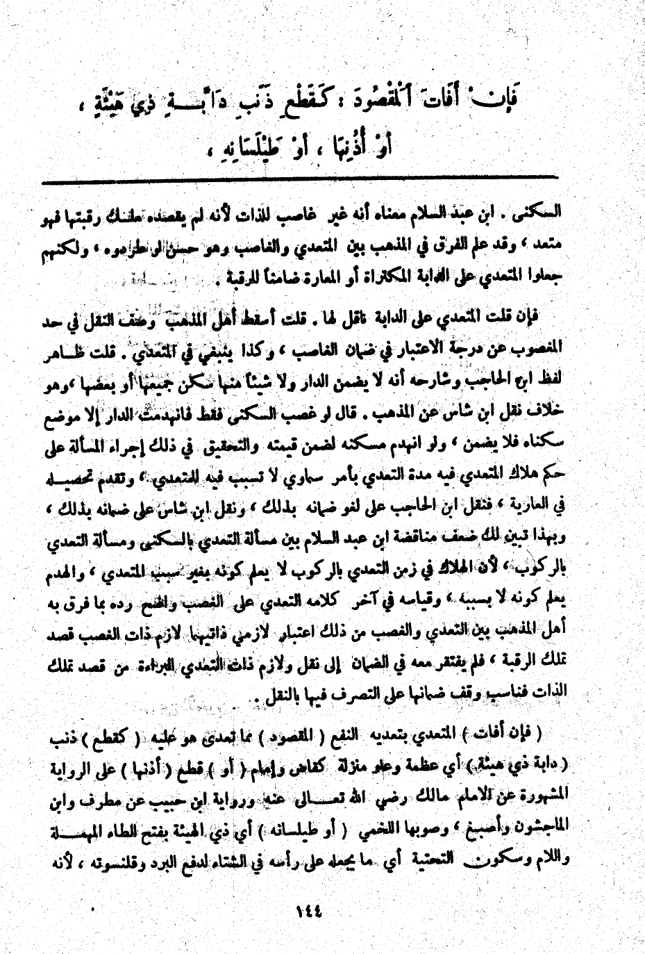 (فَإِنْ أَفَاتَ) الْمُتَعَدِّي بِتَعَدِّيهِ النَّفْعَ (الْمَقْصُودَ) مِمَّا تَعَدَّى هُوَ عَلَيْهِ (كَقَطْعِ) ذَنَبِ (دَابَّةٍ ذِي هَيْئَةٍ) أَيْ عَظَمَةٍ وَعُلُوِّ مَنْزِلَةٍ كَقَاضٍ وَإِمَامٍ (أَوْ) قَطْعِ (أُذُنِهَا) عَلَى الرِّوَايَةِ الْمَشْهُورَةِ عَنْ الْإِمَامِ مَالِكٍ - رَضِيَ اللَّهُ تَعَالَى عَنْهُ - وَرِوَايَةِ ابْنِ حَبِيبٍ عَنْ مُطَرِّفٍ وَابْنِ الْمَاجِشُونِ وَأَصْبَغَ وَصَوَّبَهَا اللَّخْمِيُّ (أَوْ طَيْلَسَانِهِ) أَيْ ذِي الْهَيْئَةِ بِفَتْحِ الطَّاءِ الْمُهْمَلَةِ وَاللَّامِ وَسُكُونِ التَّحْتِيَّةِ أَيْ مَا يَجْعَلُهُ عَلَى رَأْسِهِ فِي الشِّتَاءِ لِدَفْعِ الْبَرْدِ وَقَلَنْسُوَتِهِ لِأَنَّهُ