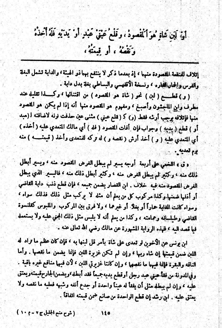 (وَ) قَطْعِ (لَبَنِ) نَحْوِ (شَاةٍ هُوَ الْمَقْصُودُ) مِنْ اقْتِنَائِهَا، وَكَذَا تَقْلِيلُهُ عِنْدَ مُطَرِّفٍ وَابْنِ الْمَاجِشُونِ وَأَصْبَغَ، وَمَفْهُومُ هُوَ الْمَقْصُودُ مِنْهَا أَنَّهُ إذَا لَمْ يَكُنْ هُوَ الْمَقْصُودُ مِنْهَا فَإِتْلَافُهُ يُوجِبُ أَرْشَهُ فَقَطْ (وَ) كَ (قَلْعِ عَيْنَيْ) مُثَنَّى عَيْنٍ حُذِفَتْ نُونُهُ لِإِضَافَتِهِ لِ (عَبْدٍ أَوْ) قَطْعِ (يَدَيْهِ) وَجَوَابُ فَإِنْ أَفَاتَ الْمَقْصُودَ (فَلَهُ) أَيْ مَالِكِ الْمُتَعَدَّى عَلَيْهِ (أَخْذُهُ) أَيْ الْمُتَعَدَّى عَلَيْهِ (وَ) أَخْذُ أَرْشِ (نَقْصِهِ وَ) لَهُ تَرْكُهُ لِلْمُتَعَدِّي وَأَخْذُ (قِيمَتِهِ) مِنْهُ يَوْمَ تَعَدِّيهِ.