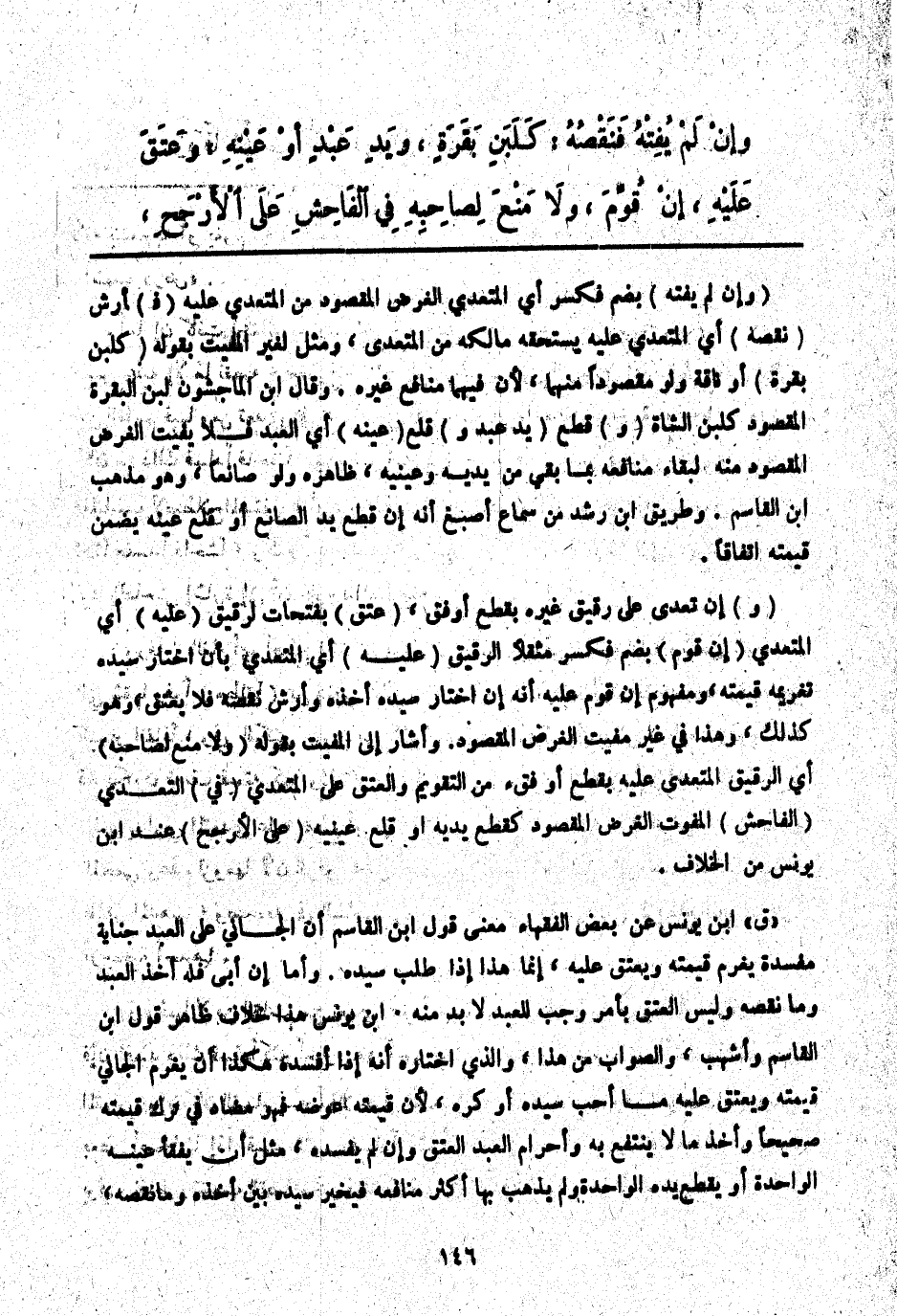 " ق " ابْنُ يُونُسَ عَنْ بَعْضِ الْفُقَهَاءِ مَعْنَى قَوْلِ ابْنِ الْقَاسِمِ أَنَّ الْجَانِيَ عَلَى الْعَبْدِ جِنَايَةً مُفْسِدَةً يَغْرَمُ قِيمَتَهُ وَيَعْتِقُ عَلَيْهِ، إنَّمَا هَذَا إذَا طَلَبَ سَيِّدُهُ. وَأَمَّا إنْ أَبَى فَلَهُ أَخْذُ الْعَبْدِ وَمَا نَقَصَهُ وَلَيْسَ الْعِتْقُ بِأَمْرٍ وَجَبَ لِلْعَبْدِ لَا بُدَّ مِنْهُ. ابْنُ يُونُسَ هَذَا خِلَافُ ظَاهِرِ قَوْلِ ابْنِ الْقَاسِمِ وَأَشْهَبَ وَالصَّوَابُ مِنْ هَذَا، وَاَلَّذِي اخْتَارَهُ أَنَّهُ إذَا أَفْسَدَهُ هَكَذَا أَنْ يَغْرَمَ الْجَانِي قِيمَتَهُ وَيَعْتِقَ عَلَيْهِ مَا أَحَبَّ سَيِّدُهُ أَوْ كَرِهَ، لِأَنَّ قِيمَتَهُ عِوَضُهُ فَهُوَ مُضَادٌّ فِي تَرْكِ قِيمَتِهِ صَحِيحًا وَأَخْذِ مَا لَا يَنْتَفِعُ بِهِ وَإِحْرَامِ الْعَبْدِ الْعِتْقَ وَإِنْ لَمْ يُفْسِدْهُ، مِثْلُ أَنْ يَقْفَأَ عَيْنَهُ الْوَاحِدَةَ أَوْ يَقْطَعَ يَدَهُ الْوَاحِدَةَ لَمْ يَذْهَبْ بِهَا أَكْثَرُ مَنَافِعِهِ فَيُخَيَّرُ سَيِّدُهُ بَيْنَ أَخْذِهِ وَمَا نَقَصَهُ،