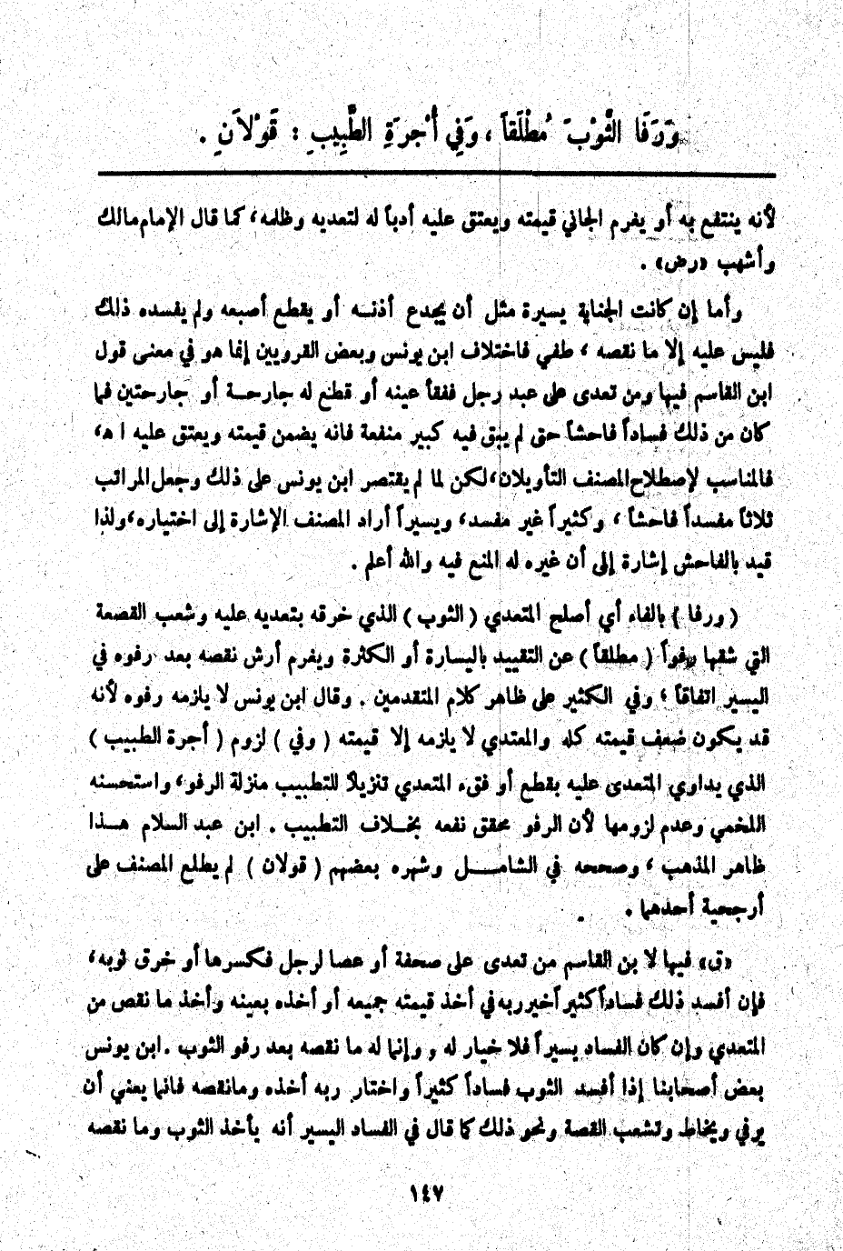 " ق " فِيهَا لِابْنِ الْقَاسِمِ مَنْ تَعَدَّى عَلَى صَحْفَةٍ أَوْ عَصًا لِرَجُلٍ فَكَسَرَهَا أَوْ خَرَقَ ثَوْبَهُ، فَإِنْ أَفْسَدَ ذَلِكَ فَسَادًا كَثِيرًا خُيِّرَ رَبُّهُ فِي أَخْذِ قِيمَتِهِ جَمِيعِهِ أَوْ أَخْذِهِ بِعَيْنِهِ وَأَخْذِ مَا نَقَصَ مِنْ الْمُتَعَدِّي، وَإِنْ كَانَ الْفَسَادُ يَسِيرًا فَلَا خِيَارَ لَهُ، وَإِنَّمَا لَهُ مَا نَقَصَهُ بَعْدَ رَفْوِ الثَّوْبِ. ابْنُ يُونُسَ بَعْضُ أَصْحَابِنَا إذَا أَفْسَدَ الثَّوْبَ فَسَادًا كَثِيرًا وَاخْتَارَ رَبُّهُ أَخْذَهُ وَمَا نَقَصَهُ فَإِنَّمَا يَعْنِي أَنْ يُرْفَى وَيُخَاطَ وَتُشْعَبُ الْقَصْعَةُ وَنَحْوُ ذَلِكَ كَمَا قَالَ فِي الْفَسَادِ الْيَسِيرِ أَنَّهُ يَأْخُذُ الثَّوْبَ وَمَا نَقَصَهُ