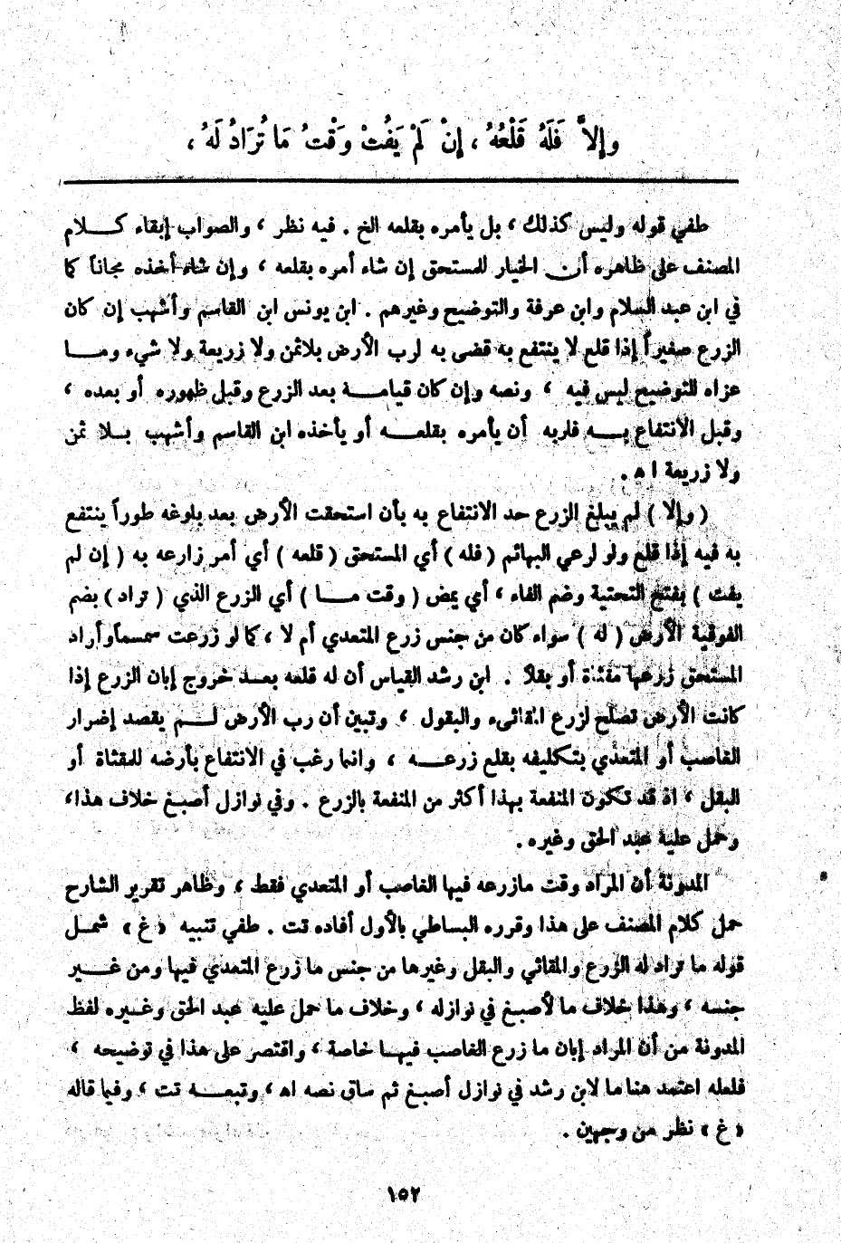 (وَإِلَّا) لَمْ يَبْلُغْ الزَّرْعُ حَدَّ الِانْتِفَاعِ بِهِ بِأَنْ اُسْتُحِقَّتْ الْأَرْضُ بَعْدَ بُلُوغِهِ طَوْرًا يُنْتَفَعُ بِهِ فِيهِ إذَا قُلِعَ وَلَوْ لِرَعْيِ الْبَهَائِمِ (فَلَهُ) أَيْ الْمُسْتَحِقِّ (قَلْعُهُ) أَيْ أَمَرَ زَارِعَهُ بِهِ (إنْ لَمْ يَفُتْ) بِفَتْحِ التَّحْتِيَّةِ وَضَمِّ الْفَاءِ، أَيْ يَمْضِ (وَقْتُ مَا) أَيْ الزَّرْعِ الَّذِي (تُرَادُ) بِضَمِّ الْفَوْقِيَّةِ الْأَرْضُ (لَهُ) سَوَاءٌ كَانَ مِنْ جِنْسِ زَرْعِ الْمُتَعَدِّي أَمْ لَا كَمَا لَوْ زُرِعَتْ سِمْسِمًا وَأَرَادَ الْمُسْتَحِقُّ زَرْعَهَا مِقْثَأَةً أَوْ بَقْلًا. ابْنُ رُشْدٍ الْقِيَاسُ أَنَّ لَهُ قَلْعَهُ بَعْدَ خُرُوجِ إبَّانِ الزَّرْعِ إذَا كَانَتْ الْأَرْضُ تَصْلُحُ لِزَرْعِ الْمَقَاثِي وَالْبُقُولِ، وَتَبَيَّنَ أَنَّ رَبَّ الْأَرْضِ لَمْ يَقْصِدْ إضْرَارَ الْغَاصِبِ أَوْ الْمُتَعَدِّي بِتَكْلِيفِهِ بِقَلْعِ زَرْعِهِ، وَإِنَّمَا رَغِبَ فِي الِانْتِفَاعِ بِأَرْضِهِ لِلْمِقْثَأَةِ أَوْ الْبَقْلِ إذْ قَدْ تَكُونُ الْمَنْفَعَةُ بِهَذَا أَكْثَرَ مِنْ الْمَنْفَعَةِ بِالزَّرْعِ. وَفِي نَوَازِلِ أَصْبَغَ خِلَافُ هَذَا، وَحَمَلَ عَلَيْهِ عَبْدُ الْحَقِّ وَغَيْرُهُ.