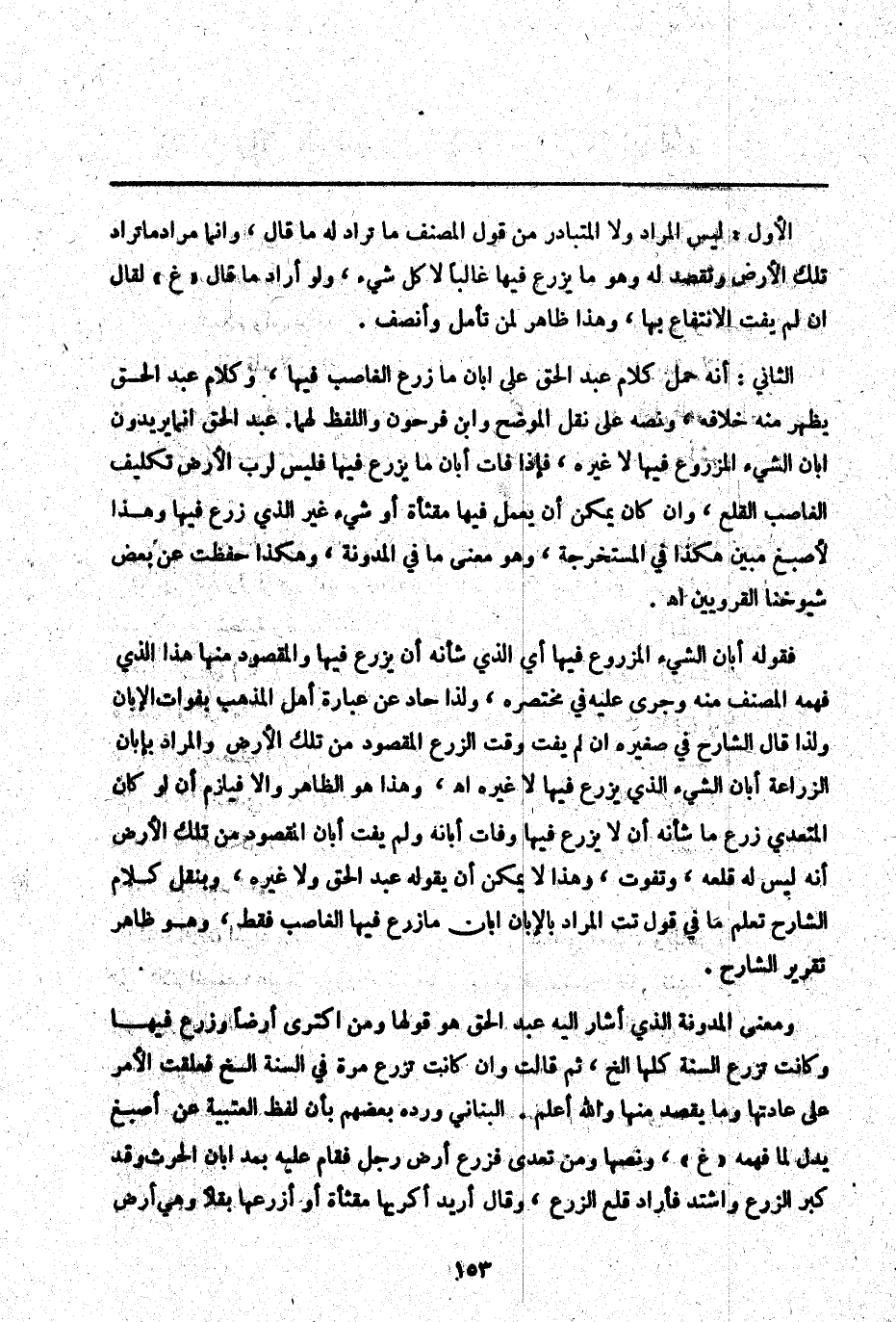 ـــــــــــــــــــــــــــــQالْأَوَّلُ: لَيْسَ الْمُرَادُ وَلَا الْمُتَبَادِرُ مِنْ قَوْلِ الْمُصَنِّفِ مَا تُرَادُ لَهُ مَا قَالَ، وَإِنَّمَا مُرَادُ مَا تُرَادُ تِلْكَ الْأَرْضُ وَتُقْصَدُ لَهُ وَهُوَ مَا يُزْرَعُ فِيهَا غَالِبًا لَا كُلُّ شَيْءٍ، وَلَوْ أَرَادَ مَا قَالَ " غ " لَقَالَ إنْ لَمْ نُفِتْ الِانْتِفَاعَ بِهَا، وَهَذَا ظَاهِرٌ لِمَنْ تَأَمَّلَ وَأَنْصَفَ.