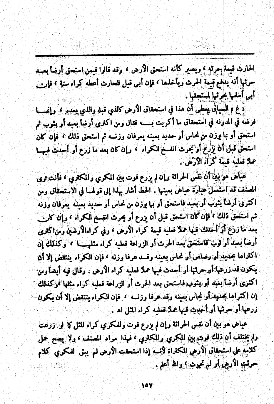وَقَالَ فِيهِ أَيْضًا وَمَنْ اكْتَرَى أَرْضًا بِعَبْدٍ أَوْ بِثَوْبٍ فَاسْتُحِقَّ بَعْدَ الْحَرْثِ أَوْ الزِّرَاعَةِ فَعَلَيْهِ كِرَاءُ مِثْلِهَا، وَكَذَلِكَ إنْ اكْتَرَاهَا بِحَدِيدٍ أَوْ نُحَاسٍ بِعَيْنِهِ وَقَدْ عَرَفَا وَزْنَهُ، فَإِنَّ الْكِرَاءَ يُنْتَقَضُ إلَّا أَنْ يَكُونَ زَرَعَهَا أَوْ حَرَثَهَا أَوْ أَحْدَثَ فِيهَا عَمَلًا فَعَلَيْهِ كِرَاءُ الْمِثْلِ اهـ. عِيَاضٌ هُوَ بَيَّنَ أَنَّ نَفْسَ الْحِرَاثَةِ وَإِنْ لَمْ يَزْرَعْ فَوْتٌ وَلِلْمُكْرِي كِرَاءُ الْمِثْلِ كَمَا لَوْ زُرِعَتْ وَلَمْ يَخْتَلِفْ أَنَّ ذَلِكَ فَوْتٌ بَيْنَ الْمُكْرِي وَالْمُكْتَرِي، فَهَذَا مُرَادُ الْمُصَنِّفِ، وَلَا يَصِحُّ حَمْلُ كَلَامِهِ عَلَى اسْتِحْقَاقِ الْأَرْضِ الْمُكْتَرَاةِ لِأَنَّهُ إذَا اُسْتُحِقَّتْ الْأَرْضُ لَمْ يَبْقَ لِلْمُكْرِي كَلَامٌ حُرِثَتْ الْأَرْضُ أَوْ لَمْ تُحْرَثْ، وَاَللَّهُ أَعْلَمُ.
