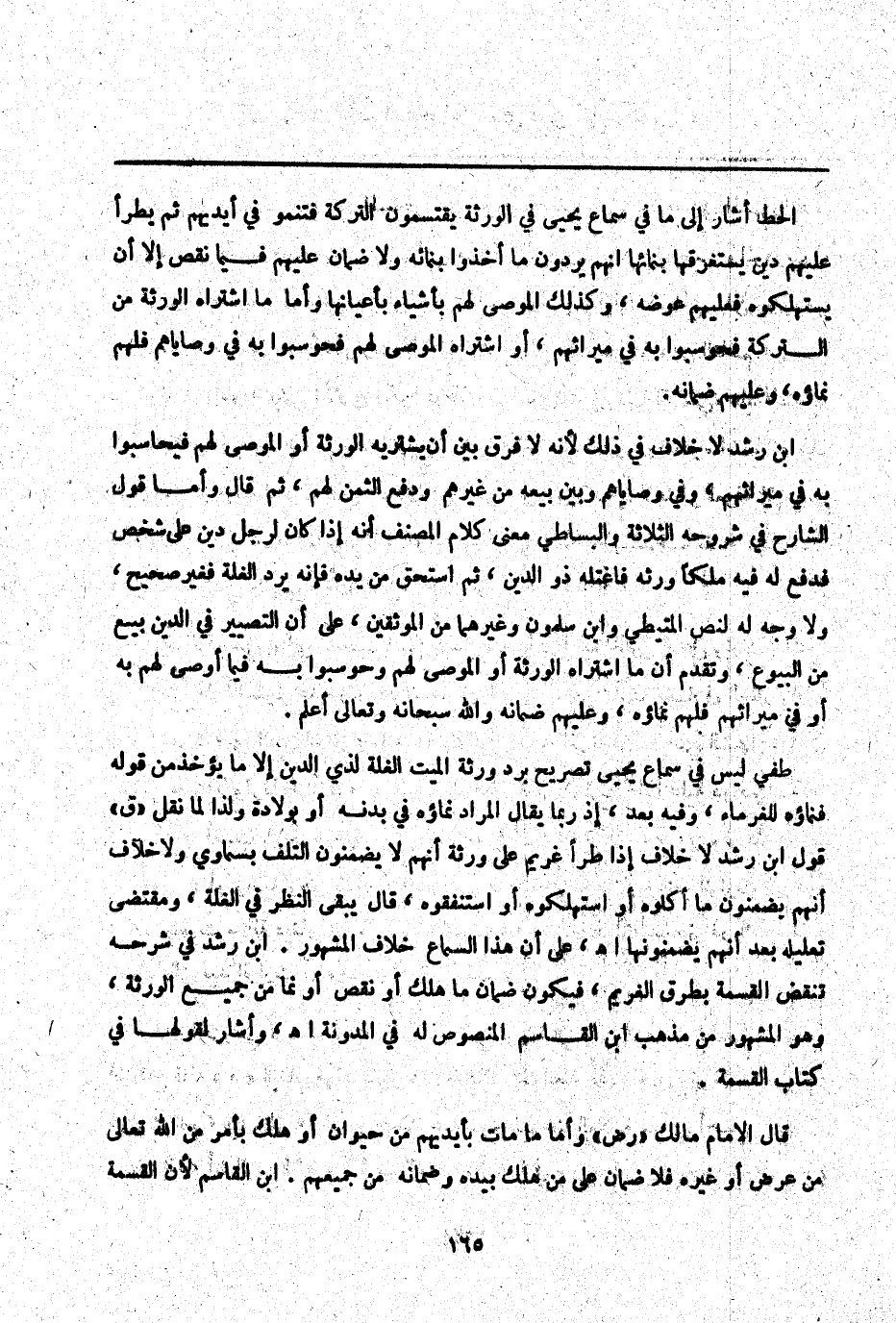 ـــــــــــــــــــــــــــــQالْحَطّ أَشَارَ إلَى مَا فِي سَمَاعِ يَحْيَى فِي الْوَرَثَةِ يَقْتَسِمُونَ التَّرِكَةَ فَتَنْمُو فِي أَيْدِيهِمْ ثُمَّ يَطْرَأُ عَلَيْهِمْ دَيْنٌ يَسْتَغْرِقُهَا بِنَمَائِهَا أَنَّهُمْ يَرُدُّونَ مَا أَخَذُوا بِنَمَائِهِ وَلَا ضَمَانَ عَلَيْهِمْ فِيمَا نَقَصَ إلَّا أَنْ يَسْتَهْلِكُوهُ فَعَلَيْهِمْ عِوَضُهُ، وَكَذَلِكَ الْمُوصَى لَهُمْ بِأَشْيَاءَ بِأَعْيَانِهَا وَأَمَّا مَا اشْتَرَاهُ الْوَرَثَةُ مِنْ التَّرِكَةِ فَحُوسِبُوا بِهِ فِي مِيرَاثِهِمْ، أَوْ اشْتَرَاهُ الْمُوصَى لَهُمْ فَحُوسِبُوا بِهِ فِي وَصَايَاهُمْ فَلَهُمْ نَمَاؤُهُ، وَعَلَيْهِمْ ضَمَانُهُ.