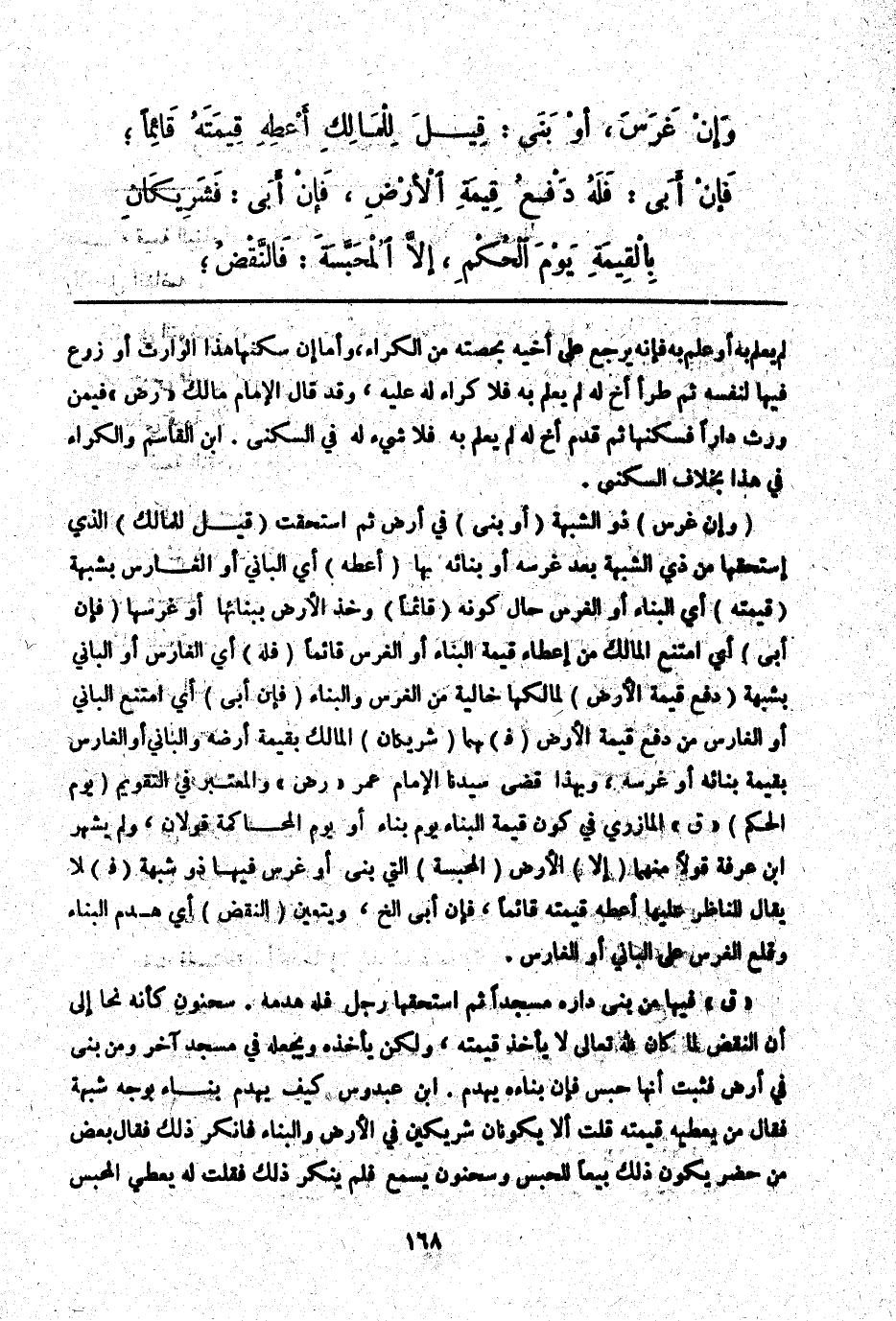 (وَإِنْ غَرَسَ) ذُو الشُّبْهَةِ (أَوْ بَنَى) فِي أَرْضٍ ثُمَّ اُسْتُحِقَّتْ (قِيلَ لِلْمَالِكِ) الَّذِي اسْتَحَقَّهَا مِنْ ذِي الشُّبْهَةِ بَعْدَ غَرْسِهِ أَوْ بِنَائِهِ بِهَا (أَعْطِهِ) أَيْ الْبَانِيَ أَوْ الْغَارِسَ بِشُبْهَةٍ (قِيمَتَهُ) أَيْ الْبِنَاءِ أَوْ الْغَرْسِ حَالَ كَوْنِهِ (قَائِمًا) وَخُذْ الْأَرْضَ بِبِنَائِهَا أَوْ غَرْسِهَا (فَإِنْ أَبَى) أَيْ امْتَنَعَ الْمَالِكُ مِنْ إعْطَاءِ قِيمَةِ الْبِنَاءِ أَوْ الْغَرْسِ قَائِمًا (فَلَهُ) أَيْ الْغَارِسِ أَوْ الْبَانِي بِشُبْهَةٍ (دَفَعَ قِيمَةَ الْأَرْضِ) لِمَالِكِهَا خَالِيَةً مِنْ الْغَرْسِ وَالْبِنَاءِ (فَإِنْ أَبَى) أَيْ امْتَنَعَ الْبَانِي أَوْ الْغَارِسُ مِنْ دَفْعِ قِيمَةِ الْأَرْضِ (فَ) هُمَا (شَرِيكَانِ) الْمَالِكُ بِقِيمَةِ أَرْضِهِ وَالْبَانِي أَوْ الْغَارِسُ بِقِيمَةِ بِنَائِهِ أَوْ غَرْسِهِ، وَبِهَذَا قَضَى سَيِّدُنَا الْإِمَامُ عُمَرُ " - رَضِيَ اللَّهُ عَنْهُ - " وَالْمُعْتَبَرُ فِي التَّقْوِيمِ (يَوْمَ الْحُكْمِ) " ق " الْمَازِرِيُّ فِي كَوْنِ قِيمَةِ الْبِنَاءِ يَوْمَ بِنَاءٍ أَوْ يَوْمَ الْمُحَاكَمَةِ قَوْلَانِ، وَلَمْ يُشْهِرْ ابْنُ عَرَفَةَ قَوْلًا مِنْهُمَا (إلَّا) الْأَرْضَ (الْمُحَبَّسَةَ) الَّتِي بَنَى أَوْ غَرَسَ فِيهَا ذُو شُبْهَةٍ (فَ) لَا يُقَالُ لِلنَّاظِرِ عَلَيْهَا أَعْطِهِ قِيمَتَهُ قَائِمًا، فَإِنْ أَبَى إلَخْ، وَيَتَعَيَّنُ (النَّقْضُ) أَيْ هَدْمُ الْبِنَاءِ وَقَلْعُ الْغَرْسِ عَلَى الْبَانِي أَوْ الْغَارِسِ.