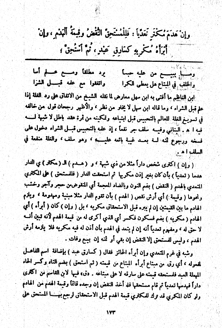 (وَإِنْ) اكْتَرَى شَخْصٌ دَارًا مَثَلًا مِنْ ذِي شُبْهَةٍ، وَ (هَدَمَ) الـ (مُكْتِرِ) ي الدَّارَ هَدْمًا (تَعَدِّيًا) بِأَنْ كَانَ بِغَيْرِ إذْنِ مُكْرِيهَا ثُمَّ اُسْتُحِقَّتْ الدَّارُ (فَلِلْمُسْتَحِقِّ) عَلَى الْمُكْتَرِي الْمُتَعَدِّي بِالْهَدْمِ (النُّقْضُ) بِضَمِّ النُّونِ وَبِالضَّادِ الْمُعْجَمَةِ أَيْ الْمَنْقُوضِ مِنْ حَجَرٍ وَآجُرَ وَخَشَبٍ وَنَحْوِهَا (وَقِيمَةُ) أَيْ أَرْشُ نَقْصِ (الْهَدْمِ) بِأَنْ تُقَوَّمَ الدَّارُ مَثَلًا مَبْنِيَّةً وَمَهْدُومَةً، وَيَلْزَمُ الْهَادِمَ مَا بَيْنَ الْقِيمَتَيْنِ إنْ لَمْ يَبَرَّهُ قَبْلَ الِاسْتِحْقَاقِ مُكْرِيهِ، بَلْ (وَإِنْ) كَانَ (أَبْرَأَهُ) أَيْ الْهَادِمُ (مُكْرِيهِ) بِضَمٍّ فَسُكُونٍ فَكَسْرٍ أَيْ الَّذِي أَكْرَى لَهُ مِنْ قِيمَةِ الْهَدْمِ لِأَنَّهُ تَبَيَّنَ أَنَّهُ لَا حَقَّ لَهُ، وَمَفْهُومُ تَعَدِّيًا أَنَّهُ إنْ لَمْ يَتَعَدَّ فِي الْهَدْمِ بِأَنْ أَذِنَ لَهُ فِيهِ مُكْرِيهِ فَلَا يَلْزَمُهُ أَرْشُ الْهَدْمِ، وَلَيْسَ لِلْمُسْتَحِقِّ إلَّا النَّقْضُ إنْ بَقِيَ أَوْ ثَمَنُهُ إنْ بِيعَ وَفَاتَ.