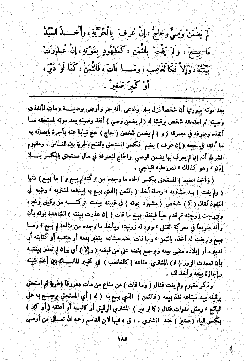ـــــــــــــــــــــــــــــQبَعْدَ مَوْتِهِ صُورَتُهَا أَنَّ شَخْصًا نَزَلَ بِبَلَدٍ وَادَّعَى أَنَّهُ حُرٌّ وَأَوْصَى بِوَصِيَّةٍ وَمَاتَ فَأُنْفِدَتْ وَصِيَّتَهُ ثُمَّ اسْتَحَقَّهُ شَخْصٌ بِرَقَبَتِهِ لَهُ (لَمْ يَضْمَنْ وَصِيٌّ) أَنْفَذَ وَصِيَّتَهُ بَعْدَ مَوْتِهِ لِمُسْتَحِقِّهِ مَا أَنْفَذَهُ وَصَرَفَهُ فِي مَصْرِفِهِ (وَ) لَمْ يَضْمَنْ شَخْصٌ (حَاجٌّ) حَجَّ نِيَابَةً عَنْهُ بِأُجْرَةٍ بِإِيصَائِهِ بِهِ مَا أَنْفَقَهُ فِي حَجِّهِ (إنْ عُرِفَ) بِضَمٍّ فَكَسْرٍ الْمُسْتَحَقُّ بِالْفَتْحِ بِالْحُرِّيَّةِ بَيْنَ النَّاسِ. وَمَفْهُومُ الشَّرْطِ أَنَّهُ إنْ لَمْ يُعْرَفْ بِهَا يَضْمَنُ الْوَصِيُّ وَالْحَاجُّ لِتَصَرُّفِهِ فِي مَالٍ مُسْتَحِقٍّ بِالْكَسْرِ بِلَا إذْنٍ، وَهُوَ كَذَلِكَ نَصَّ عَلَيْهِ الْبَاجِيَّ.