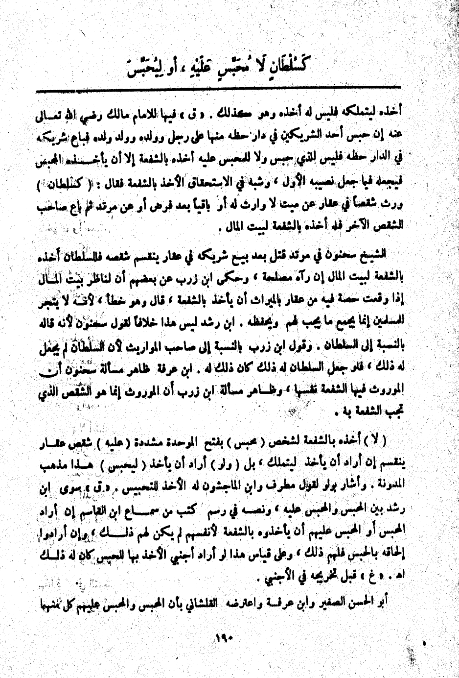ـــــــــــــــــــــــــــــQأَخْذَهُ لِيَتَمَلَّكَهُ فَلَيْسَ لَهُ أَخْذُهُ وَهُوَ كَذَلِكَ. " ق " فِيهَا لِلْإِمَامِ مَالِكٍ - رَضِيَ اللَّهُ تَعَالَى عَنْهُ - إنْ حَبَسَ أَحَدُ الشَّرِيكَيْنِ فِي دَارٍ حَظَّهُ مِنْهَا عَلَى رَجُلٍ وَوَلَدِهِ وَوَلَدِ وَلَدِهِ فَبَاعَ شَرِيكُهُ فِي الدَّارِ حَظَّهُ فَلَيْسَ لِلَّذِي حَبَسَ وَلَا لِلْمُحَبَّسِ عَلَيْهِ أَخْذُهُ بِالشُّفْعَةِ إلَّا أَنْ يَأْخُذَهُ الْمُحَبِّسُ فَيَجْعَلَهُ فِيمَا جَعَلَ نَصِيبَهُ الْأَوَّلَ، وَشَبَّهَ فِي الِاسْتِحْقَاقِ الْأَخْذَ بِالشُّفْعَةِ فَقَالَ: (كَسُلْطَانٍ) وَرِثَ شِقْصًا فِي عَقَارٍ عَنْ مَيِّتٍ لَا وَارِثَ لَهُ أَوْ بَاقِيًا بَعْدَ فَرْضٍ أَوْ عَنْ مُرْتَدٍّ ثُمَّ بَاعَ صَاحِبُ الشِّقْصِ الْآخَرِ فَلَهُ أَخْذُهُ بِالشُّفْعَةِ لِبَيْتِ الْمَالِ.