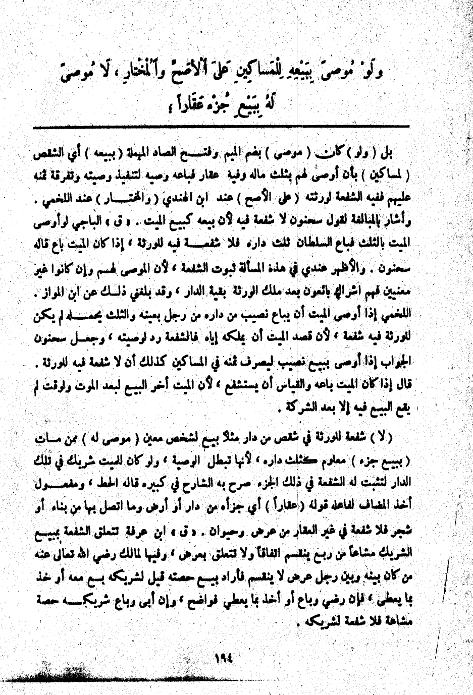 اللَّخْمِيُّ إذَا أَوْصَى الْمَيِّتُ أَنْ يُبَاعَ نَصِيبٌ مِنْ دَارِهِ مِنْ رَجُلٍ بِعَيْنِهِ وَالثُّلُثُ يَحْمِلُهُ لَمْ يَكُنْ لِلْوَرَثَةِ فِيهِ شُفْعَةٌ، لِأَنَّ قَصْدَ الْمَيِّتِ أَنْ يُمَلِّكَهُ إيَّاهُ فَالشُّفْعَةُ رَدٌّ لِوَصِيَّتِهِ، وَجَعَلَ سَحْنُونٌ الْجَوَابَ إذَا أَوْصَى بِبَيْعِ نَصِيبٍ لِيَصْرِفَ ثَمَنَهُ فِي الْمَسَاكِينِ كَذَلِكَ أَنْ لَا شُفْعَةَ فِيهِ لِلْوَرَثَةِ قَالَ إذَا كَانَ الْمَيِّتُ بَاعَهُ وَالْقِيَاسُ أَنْ يَسْتَشْفِعَ لِأَنَّ الْمَيِّتَ أَخَّرَ الْبَيْعَ لِبَعْدِ الْمَوْتِ وَلِوَقْتٍ لَمْ يَقَعْ الْبَيْعُ فِيهِ إلَّا بَعْدَ الشَّرِكَةِ.