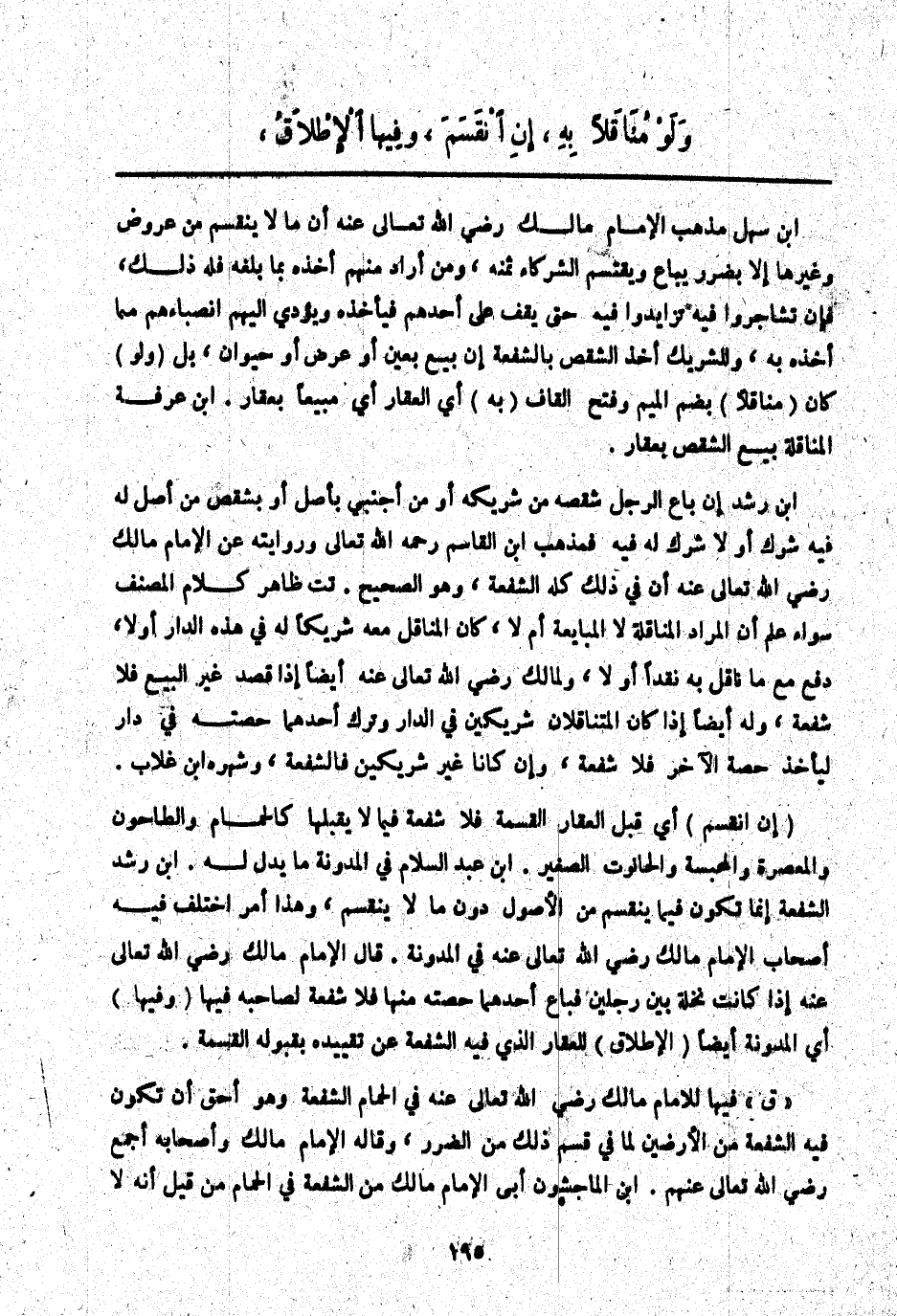 (إنْ انْقَسَمَ) أَيْ قَبِلَ الْعَقَارُ الْقِسْمَةَ فَلَا شُفْعَةَ فِيمَا لَا يَقْبَلُهَا كَالْحَمَّامِ وَالطَّاحُونِ وَالْمَعْصَرَةِ وَالْمُحَبَّسَةِ وَالْحَانُوتِ الصَّغِيرِ. ابْنُ عَبْدِ السَّلَامِ فِي الْمُدَوَّنَةِ مَا يَدُلُّ لَهُ. ابْنُ رُشْدٍ الشُّفْعَةُ إنَّمَا تَكُونُ فِيمَا يُقْسَمُ مِنْ الْأُصُولِ دُونَ مَا لَا يَنْقَسِمُ، وَهَذَا أَمْرٌ اخْتَلَفَ فِيهِ أَصْحَابُ الْإِمَامِ مَالِكٍ - رَضِيَ اللَّهُ تَعَالَى عَنْهُ - فِي الْمُدَوَّنَةِ. قَالَ الْإِمَامُ مَالِكٌ - رَضِيَ اللَّهُ تَعَالَى عَنْهُ - إذَا كَانَتْ نَخْلَةٌ بَيْنَ رَجُلَيْنِ فَبَاعَ أَحَدُهُمَا حِصَّتَهُ مِنْهَا فَلَا شُفْعَةَ لِصَاحِبِهِ فِيهَا (وَفِيهَا) أَيْ الْمُدَوَّنَةِ أَيْضًا (الْإِطْلَاقُ) لِلْعَقَارِ الَّذِي فِيهِ الشُّفْعَةُ عَنْ تَقْيِيدِهِ بِقَبُولِهِ الْقِسْمَةَ.