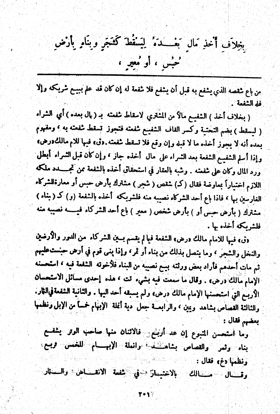 (بِخِلَافِ أَخْذِ) الشَّفِيعِ مَالًا مِنْ الْمُشْتَرِي لِإِسْقَاطِ شُفْعَتِهِ بِ (مَالٍ بَعْدَهُ) أَيْ الشِّرَاءِ (لِيُسْقِطَ) بِضَمِّ التَّحْتِيَّةِ وَكَسْرِ الْقَافِ الشَّفِيعُ شُفْعَتَهُ فَتَجُوزُ تَسْقُطُ شُفْعَتُهُ بِهِ، وَمَفْهُومُ بَعْدِهِ أَنَّهُ لَا يَجُوزُ أَخْذُهُ مَالًا قَبْلَهُ وَإِنْ وَقَعَ فَلَا تَسْقُطُ شُفْعَتُهُ. " ق " فِيهَا لِلْإِمَامِ مَالِكٍ " - رَضِيَ اللَّهُ عَنْهُ - " وَإِذَا أَسْلَمَ الشَّفِيعُ الشُّفْعَةَ بَعْدَ الشِّرَاءِ عَلَى مَالٍ أَخَذَهُ جَازَ، وَإِنْ كَانَ قَبْلَ الشِّرَاءِ أَبْطَلَ وَرَدَّ الْمَالَ وَكَانَ عَلَى شُفْعَتِهِ. وَشَبَّهَ بِالْعَقَارِ فِي اسْتِحْقَاقِ أَخْذِهِ بِالشُّفْعَةِ مِمَّنْ تَجَدَّدَ مِلْكُهُ اللَّازِمُ اخْتِيَارًا بِمُعَاوَضَةٍ فَقَالَ (كَ) شِقْصِ (شَجَرٍ) مُشْتَرَكٍ بِأَرْضِ حَبْسٍ أَوْ مُعَارَةٍ لِلشُّرَكَاءِ الْغَارِسِينَ بِهَا، فَإِذَا بَاعَ أَحَدُ الشُّرَكَاءِ نَصِيبَهُ مِنْهُ فَلِشَرِيكِهِ أَخْذُهُ بِالشُّفْعَةِ (وَ) كَ (بِنَاءٍ) مُشْتَرَكٍ (بِأَرْضِ حَبْسٍ أَوْ) بِأَرْضِ شَخْصٍ (مُعِيرٍ) بَاعَ أَحَدُ الشُّرَكَاءِ فِيهِ نَصِيبَهُ مِنْهُ فَلِشَرِيكِهِ أَخْذُهُ بِهَا.