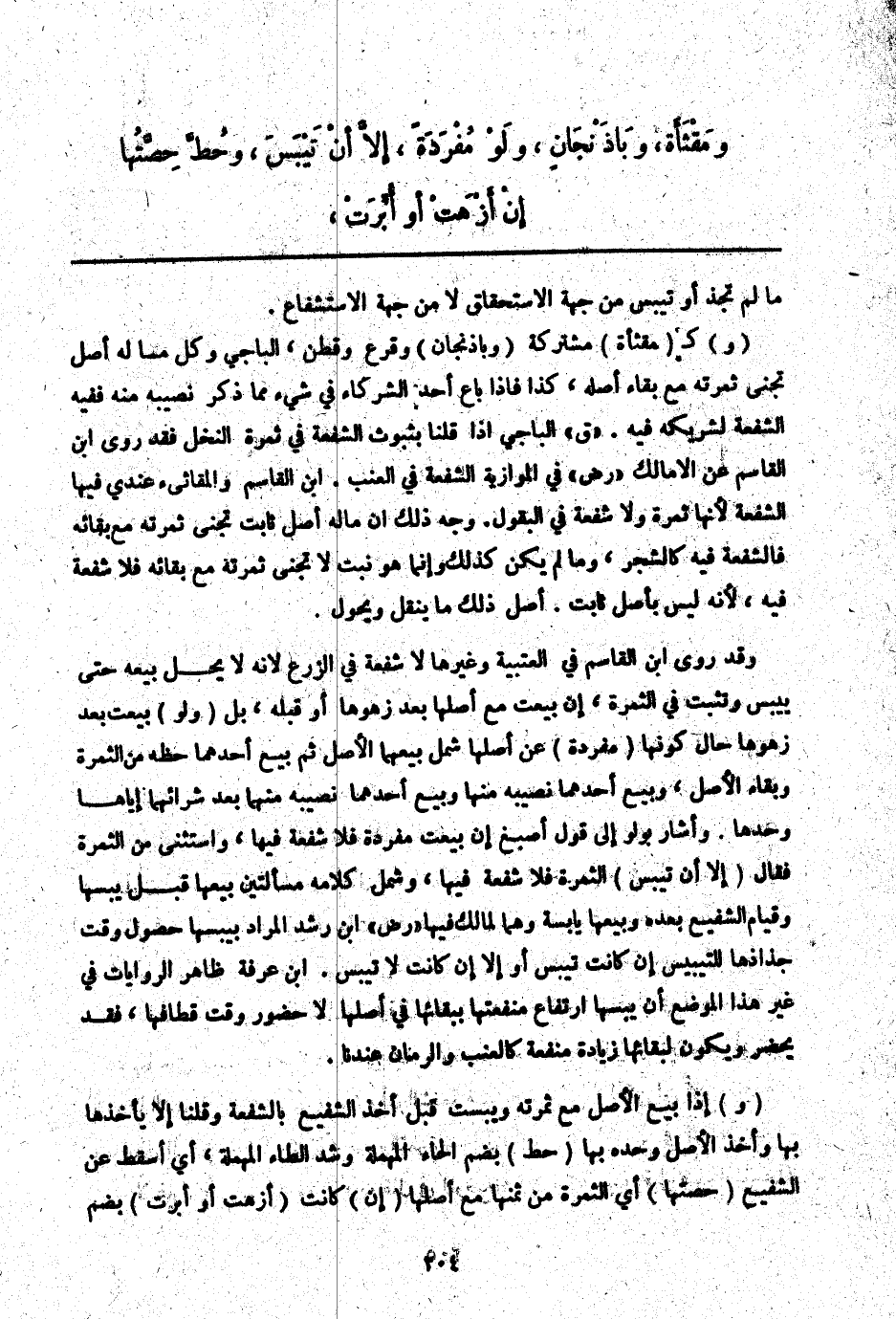 ـــــــــــــــــــــــــــــQمَا لَمْ تُجَذَّ أَوْ تَيْبَسْ مِنْ جِهَةِ الِاسْتِحْقَاقِ لَا مِنْ جِهَةِ الِاسْتِشْفَاعِ. (وَ) كَ (مَقْثَأَةٍ) مُشْتَرَكَةٍ (وَبَاذِنْجَانٍ) وَقَرْعٍ وَقُطْنٍ الْبَاجِيَّ وَكُلُّ مَا لَهُ أَصْلٌ تُجْنَى ثَمَرَتُهُ مَعَ بَقَاءِ أَصْلِهِ، كَذَا فَإِذَا بَاعَ أَحَدُ الشُّرَكَاءِ فِي شَيْءٍ مِمَّا ذُكِرَ نَصِيبَهُ مِنْهُ فَفِيهِ الشُّفْعَةُ لِشَرِيكِهِ فِيهِ. " ق " الْبَاجِيَّ إذَا قُلْنَا بِثُبُوتِ الشُّفْعَةِ فِي ثَمَرَةِ النَّخْلِ فَقَدْ رَوَى ابْنُ الْقَاسِمِ عَنْ الْإِمَامِ مَالِكٍ " - رَضِيَ اللَّهُ عَنْهُ - " فِي الْمَوَّازِيَّةِ الشُّفْعَةُ فِي الْعِنَبِ. ابْنُ الْقَاسِمِ وَالْمَقَاثِئُ عِنْدِي فِيهَا الشُّفْعَةُ لِأَنَّهَا ثَمَرَةٌ وَلَا شُفْعَةَ فِي الْبُقُولِ. وَجْهُ ذَلِكَ أَنَّ مَالَهُ أَصْلٌ ثَابِتٌ تُجْنَى ثَمَرَتُهُ مَعَ بَقَائِهِ فَالشُّفْعَةُ فِيهِ كَالشَّجَرِ، وَمَا لَمْ يَكُنْ كَذَلِكَ وَإِنَّمَا هُوَ نَبْتٌ لَا تُجْنَى ثَمَرَتُهُ مَعَ بَقَائِهِ فَلَا شُفْعَةَ فِيهِ لِأَنَّهُ لَيْسَ بِأَصْلٍ ثَابِتٍ. أَصْلُ ذَلِكَ مَا يُنْقَلُ وَيُحَوَّلُ.