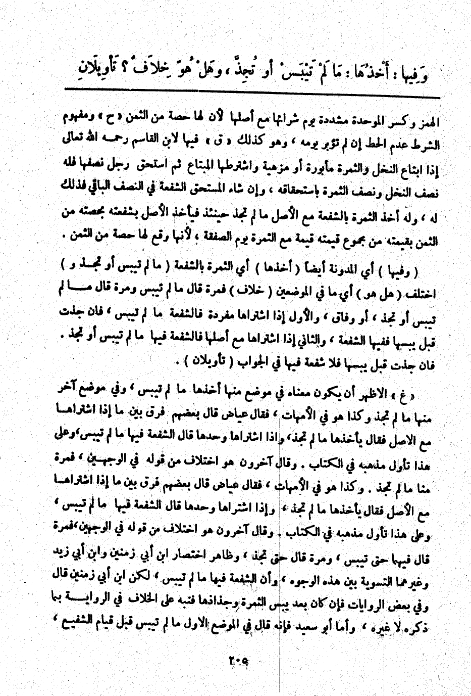 " غ " الْأَظْهَرُ أَنْ يَكُونَ مَعْنَاهُ فِي مَوْضِعٍ مِنْهَا أَخَذَهَا مَا لَمْ تَيْبَسْ، وَفِي مَوْضِعٍ آخَرَ مِنْهَا مَا لَمْ تُجَذَّ وَكَذَا هُوَ فِي الْأُمَّهَاتِ، فَقَالَ عِيَاضٌ قَالَ بَعْضُهُمْ فَرَّقَ بَيْنَ مَا إذَا اشْتَرَاهَا مَعَ الْأَصْلِ فَقَالَ يَأْخُذُهَا مَا لَمْ تُجَذَّ، وَإِذَا اشْتَرَاهَا وَحْدَهَا قَالَ الشُّفْعَةُ فِيهَا مَا لَمْ تَيْبَسْ، وَعَلَى هَذَا تَأَوَّلَ مَذْهَبَهُ فِي الْكِتَابِ. وَقَالَ آخَرُونَ هُوَ اخْتِلَافٌ مِنْ قَوْلِهِ فِي الْوَجْهَيْنِ، فَمَرَّةً قَالَ فِيهِمَا حَتَّى تَيْبَسَ، وَمَرَّةً قَالَ حَتَّى تُجَذَّ، وَظَاهِرُ اخْتِصَارِ ابْنِ أَبِي زَمَنِينَ وَابْنِ أَبِي زَيْدٍ وَغَيْرِهِمَا التَّسْوِيَةُ بَيْنَ هَذِهِ الْوُجُوهِ، وَأَنَّ الشُّفْعَةَ فِيهَا مَا لَمْ تَيْبَسْ، لَكِنْ ابْنُ أَبِي زَمَنِينَ قَالَ وَفِي بَعْضِ الرِّوَايَاتِ فَإِنْ كَانَ بَعْدَ يُبْسِ الثَّمَرَةِ وَجُذَاذِهَا فَنَبَّهَ عَلَى الْخِلَافِ فِي الرِّوَايَةِ بِمَا ذَكَرَهُ لَا غَيْرِهِ، وَأَمَّا أَبُو سَعِيدٍ فَإِنَّهُ قَالَ فِي الْمَوْضِعِ الْأَوَّلِ مَا لَمْ تَيْبَسْ قَبْلَ قِيَامِ الشَّفِيعِ،