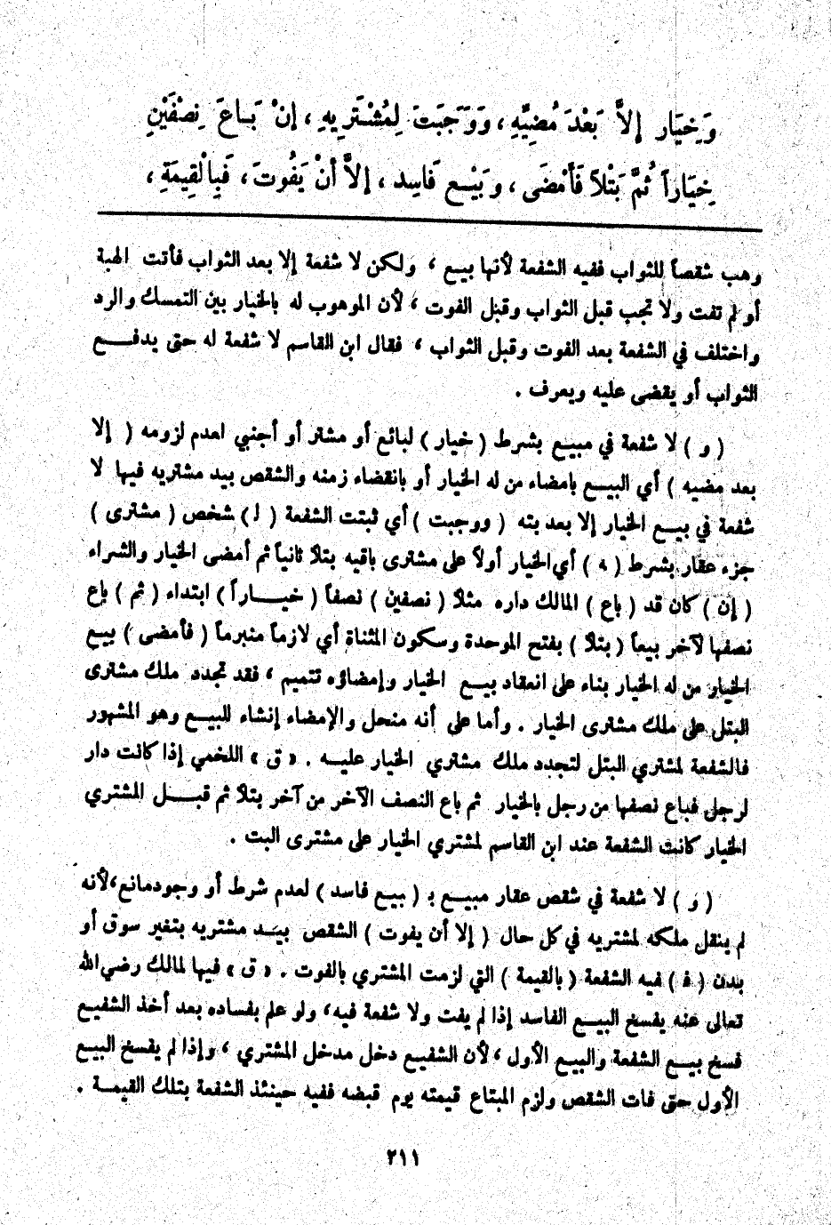 (وَ) لَا شُفْعَةَ فِي مَبِيعٍ بِشَرْطِ (خِيَارٍ) لِبَائِعٍ أَوْ مُشْتَرٍ أَوْ أَجْنَبِيٍّ لِعَدَمِ لُزُومِهِ (إلَّا بَعْدَ مُضِيِّهِ) أَيْ الْبَيْعِ بِإِمْضَاءِ مَنْ لَهُ الْخِيَارُ أَوْ بِانْقِضَاءِ زَمَنِهِ وَالشِّقْصُ بِيَدِ مُشْتَرِيهِ فِيهَا لَا شُفْعَةَ فِي بَيْعِ الْخِيَارِ إلَّا بَعْدَ بَتِّهِ (وَوَجَبَتْ) أَيْ ثَبَتَتْ الشُّفْعَةُ (لِ) شَخْصٍ (مُشْتَرِي) جُزْءَ عَقَارٍ بِشَرْطِ (هـ) أَيْ الْخِيَارِ أَوَّلًا عَلَى مُشْتَرِي بَاقِيهِ بَتْلًا ثَانِيًا أَمْضَى الْخِيَارَ وَالشِّرَاءَ (إنْ) كَانَ قَدْ (بَاعَ) الْمَالِكُ دَارِهِ مَثَلًا (نِصْفَيْنِ) نِصْفًا (خِيَارًا) ابْتِدَاءً (ثُمَّ) بَاعَ نِصْفَهَا لِآخَرَ بَيْعًا (بَتْلًا) بِفَتْحِ الْمُوَحَّدَةِ وَسُكُونِ الْمُثَنَّاةِ أَيْ لَازِمًا مُنْبَرِمًا (فَأَمْضَى) بَيْعَ الْخِيَارِ مَنْ لَهُ الْخِيَارُ بِنَاءً عَلَى انْعِقَادِ بَيْعِ الْخِيَارِ وَإِمْضَاؤُهُ تَتْمِيمٌ، فَقَدْ تَجَدَّدَ مِلْكُ مُشْتَرِي الْبَتْلَ عَلَى مِلْكِ مُشْتَرِي الْخِيَارَ. وَأَمَّا عَلَى أَنَّهُ مُنْحَلٌّ وَالْإِمْضَاءُ إنْشَاءٌ لِلْبَيْعِ وَهُوَ الْمَشْهُورُ فَالشُّفْعَةُ لِمُشْتَرِي الْبَتْلَ لِتَجَدُّدِ مِلْكِ مُشْتَرِي الْخِيَارَ عَلَيْهِ. " ق " اللَّخْمِيُّ إذَا كَانَتْ دَارٌ لِرَجُلٍ فَبَاعَ نِصْفَهَا مِنْ رَجُلٍ بِالْخِيَارِ ثُمَّ بَاعَ النِّصْفَ الْآخَرَ مِنْ آخَرَ بَتْلًا ثُمَّ قَبِلَ الْمُشْتَرِي الْخِيَارَ كَانَتْ الشُّفْعَةُ عِنْدَ ابْنِ الْقَاسِمِ لِمُشْتَرِي الْخِيَارَ عَلَى مُشْتَرِي الْبَتْلَ.