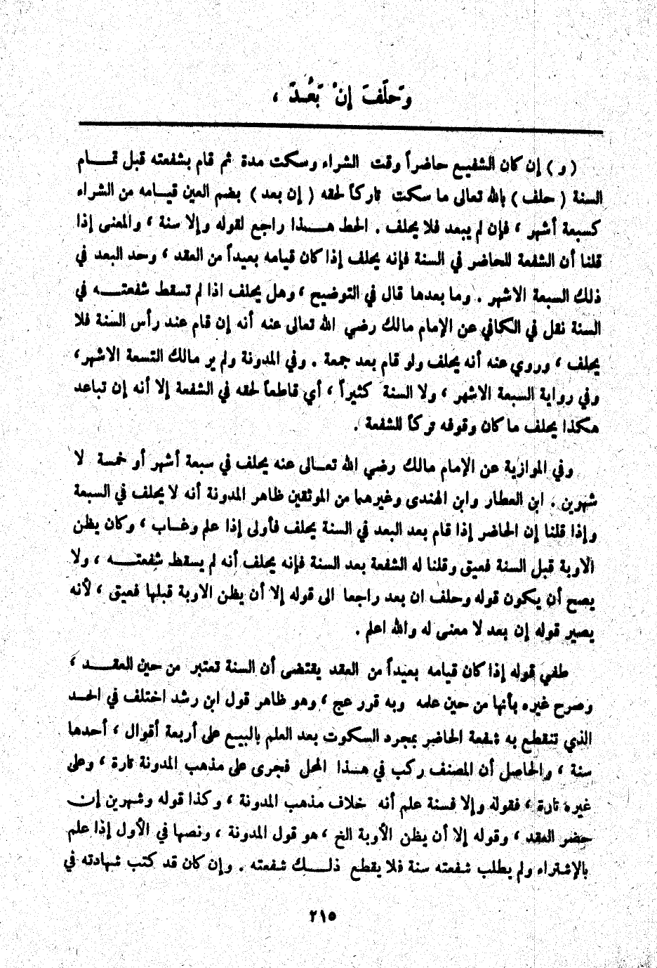 ـــــــــــــــــــــــــــــQوَ) إنْ كَانَ الشَّفِيعُ حَاضِرًا وَقْتَ الشِّرَاءِ وَسَكَتَ مُدَّةً ثُمَّ قَامَ بِشُفْعَتِهِ قَبْلَ تَمَامِ السَّنَةِ (حَلَفَ) بِاَللَّهِ تَعَالَى مَا سَكَتَ تَارِكًا لِحَقِّهِ (إنْ بَعُدَ) بِضَمِّ الْعَيْنِ قِيَامُهُ مِنْ الشِّرَاءِ كَسَبْعَةِ أَشْهُرٍ، فَإِنْ لَمْ يَبْعُدْ فَلَا يَحْلِفُ. الْحَطّ هَذَا رَاجِعٌ لِقَوْلِهِ وَإِلَّا سَنَةً، وَالْمَعْنَى إذَا قُلْنَا أَنَّ الشُّفْعَةَ لِلْحَاضِرِ فِي السَّنَةِ فَإِنَّهُ يَحْلِفُ إذَا كَانَ قِيَامُهُ بَعِيدًا مِنْ الْعَقْدِ، وَحَدُّ الْبُعْدِ فِي ذَلِكَ السَّبْعَةُ الْأَشْهُرُ. وَمَا بَعْدَهَا قَالَ فِي التَّوْضِيحِ، وَهَلْ يَحْلِفُ إذَا لَمْ تَسْقُطْ شُفْعَتُهُ فِي السَّنَةِ نَقَلَ فِي الْكَافِي عَنْ الْإِمَامِ مَالِكٍ - رَضِيَ اللَّهُ تَعَالَى عَنْهُ - أَنَّهُ إنْ قَامَ عِنْدَ رَأْسِ السَّنَةِ فَلَا يَحْلِفُ، وَرُوِيَ عَنْهُ أَنَّهُ يَحْلِفُ وَلَوْ قَامَ بَعْدَ جُمُعَةٍ. وَفِي الْمُدَوَّنَةِ وَلَمْ يَرَ مَالِكٌ التِّسْعَةَ الْأَشْهُرَ، وَفِي رِوَايَةٍ السَّبْعَةَ الْأَشْهُرَ، وَلَا السَّنَةَ كَثِيرًا، أَيْ قَاطِعًا لِحَقِّهِ فِي الشُّفْعَةِ إلَّا أَنَّهُ إنْ تَبَاعَدَ هَكَذَا يَحْلِفُ مَا كَانَ وُقُوفُهُ تَرْكًا لِلشُّفْعَةِ.