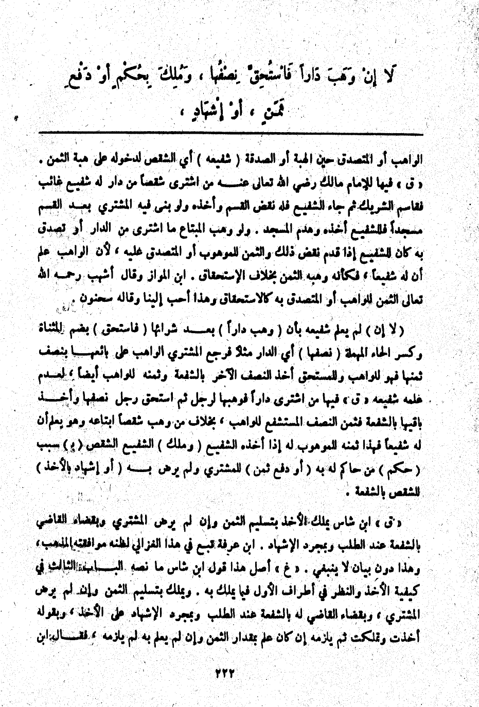 " ق " ابْنُ شَاسٍ يَمْلِكُ الْأَخْذَ بِتَسْلِيمِ الثَّمَنِ وَإِنْ لَمْ يَرْضَ الْمُشْتَرِي وَبِقَضَاءِ الْقَاضِي بِالشُّفْعَةِ عِنْدَ الطَّلَبِ وَبِمُجَرَّدِ الْإِشْهَادِ. ابْنُ عَرَفَةَ تَبِعَ فِي هَذَا الْغَزَالِيَّ لِظَنِّهِ مُوَافَقَتَهُ الْمَذْهَبَ، وَهَذَا دُونَ بَيَانٍ لَا يَنْبَغِي. " غ " أَصْلُ هَذَا قَوْلُ ابْنِ شَاسٍ مَا نَصُّهُ الْبَابُ الثَّالِثُ فِي كَيْفِيَّةِ الْأَخْذِ وَالنَّظَرِ فِي أَطْرَافِ الْأَوَّلِ فِيمَا يَمْلِكُ بِهِ. وَيَمْلِكُ بِتَسْلِيمِ الثَّمَنِ وَإِنْ لَمْ يَرْضَ الْمُشْتَرِي، وَبِقَضَاءِ الْقَاضِي لَهُ بِالشُّفْعَةِ عِنْدَ الطَّلَبِ وَبِمُجَرَّدِ الْإِشْهَادِ عَلَى الْأَخْذِ، وَبِقَوْلِهِ أَخَذْت وَتَمَلَّكْت ثُمَّ يَلْزَمُهُ إنْ كَانَ عَلِمَ بِمِقْدَارِ الثَّمَنِ وَإِنْ لَمْ يَعْلَمْ بِهِ لَمْ يَلْزَمْهُ، فَقَالَ ابْنُ الْحَاجِبِ