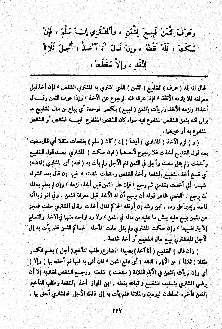 (وَإِنْ قَالَ) الشَّفِيعُ (أَنَا آخُذُ) بِصِيغَةِ الْمُضَارِعِ وَطَلَبَ التَّأْخِيرَ (أُجِّلَ) بِضَمٍّ فَكَسْرٍ مُثَقَّلًا (ثَلَاثًا) مِنْ الْأَيَّامِ (لِلنَّقْدِ) أَيْ دَفْعِ الثَّمَنِ، فَإِنْ أَتَى بِهِ فِيهَا ثُمَّ أَخَذَهُ بِهَا (وَإِلَّا) أَيْ وَإِنْ لَمْ يَأْتِ بِالثَّمَنِ فِي الْأَيَّامِ الثَّلَاثَةِ (سَقَطَتْ) شُفْعَتُهُ وَرَجَعَ الشِّقْصُ لِمُشْتَرِيهِ إلَّا أَنْ يَرْضَى الْمُشْتَرِي بِتَسْلِيمِهِ لِلشَّفِيعِ وَاتِّبَاعِهِ بِثَمَنِهِ. ابْنُ الْمَوَّازِ أَخَذَ بِالشُّفْعَةِ وَطَلَبَ التَّأْخِيرَ بِالثَّمَنِ فَأَخَّرَهُ السُّلْطَانُ الْيَوْمَيْنِ وَالثَّلَاثَةَ فَلَمْ يَأْتِ بِهِ إلَى ذَلِكَ الْأَجَلِ فَالْمُشْتَرِي أَحَقُّ بِهَا.