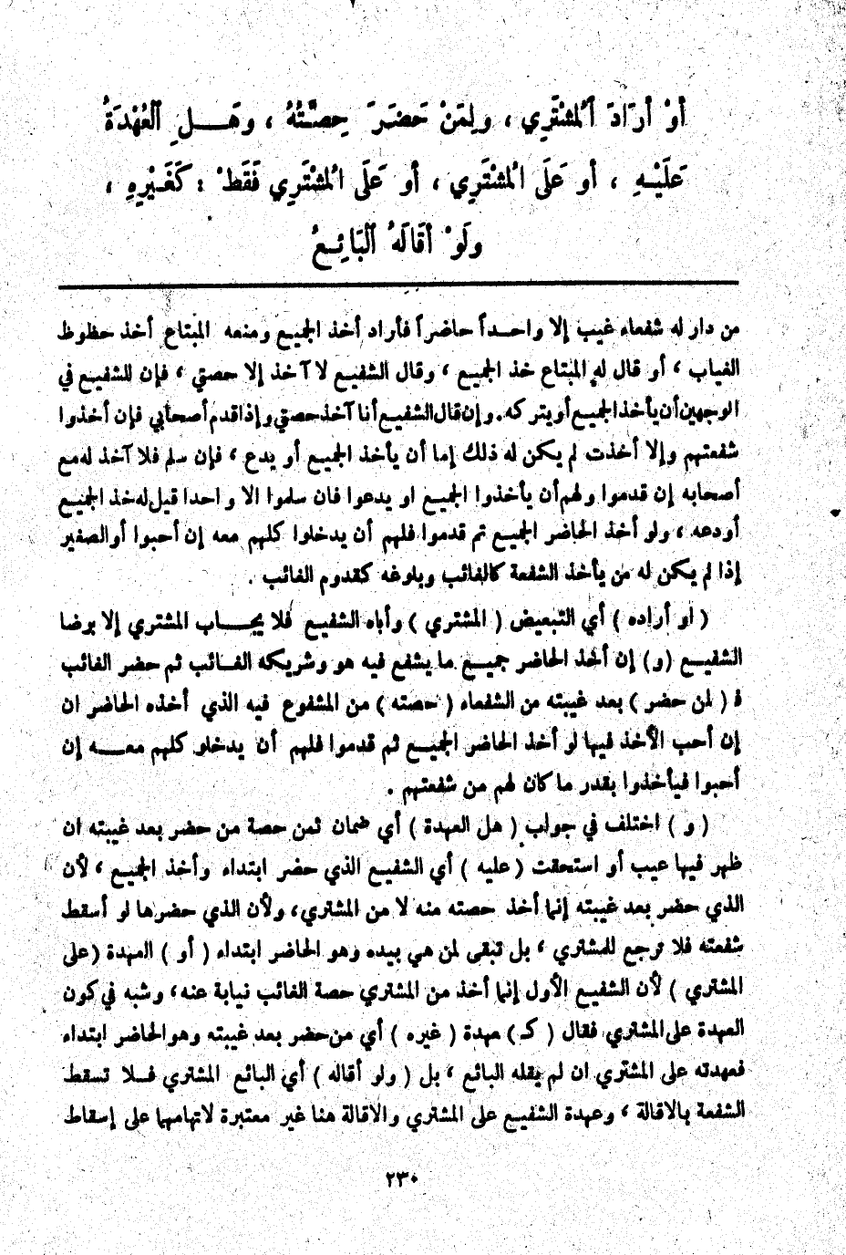 أَوْ أَرَادَ الْمُشْتَرِي، وَلِمَنْ حَضَرَ حِصَّتُهُ، وَهَلْ الْعُهْدَةُ عَلَيْهِ، أَوْ عَلَى الْمُشْتَرِي، أَوْ عَلَى الْمُشْتَرِي فَقَطْ: كَغَيْرِهِ، وَلَوْ أَقَالَهُ الْبَائِعُ