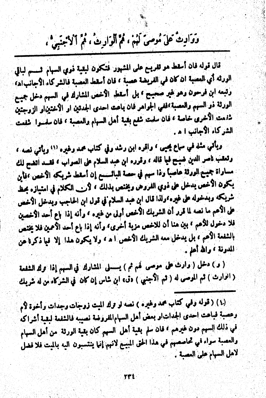 (وَ) دَخَلَ (وَارِثٌ عَلَى مُوصًى لَهُمْ ثُمَّ) يَلِي الْمُشَارِكَ فِي السَّهْمِ إذَا تَرَكَ الشُّفْعَةَ (الْوَارِثُ) ثُمَّ الْمُوصَى لَهُ (ثُمَّ الْأَجْنَبِيُّ) " ق " ابْنُ شَاسٍ إنْ كَانَ فِي الشُّرَكَاءِ مَنْ لَهُ شَرِيكٌ