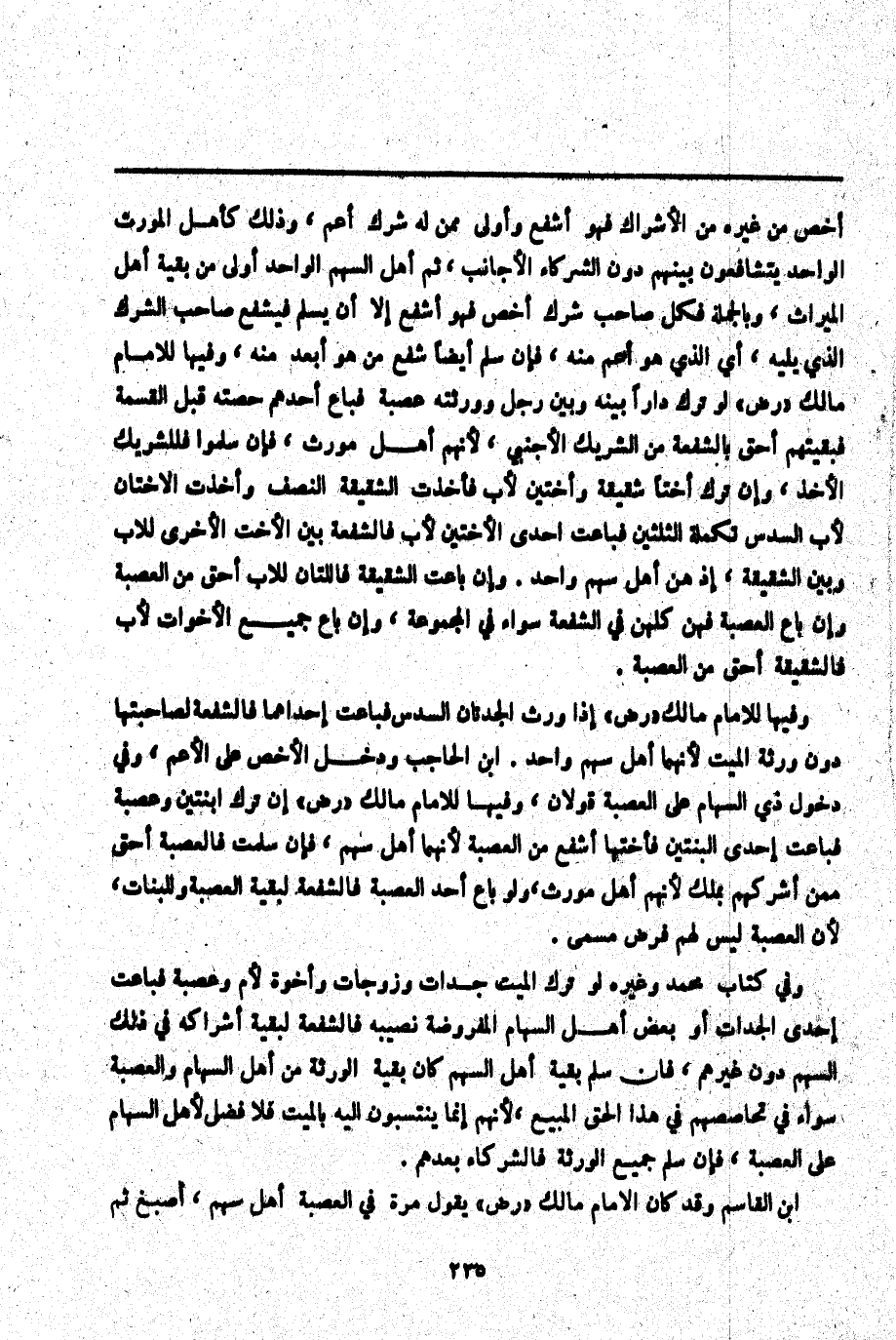 ـــــــــــــــــــــــــــــQأَخَصُّ مِنْ غَيْرِهِ مِنْ الْأَشْرَاكِ فَهُوَ أَشْفَعُ وَأَوْلَى مِمَّنْ لَهُ شِرْكٌ أَعَمُّ، وَذَلِكَ كَأَهْلِ الْمُوَرِّثِ الْوَاحِدِ يَتَشَافَعُونَ بَيْنَهُمْ دُونَ الشُّرَكَاءِ الْأَجَانِبِ، ثُمَّ أَهْلُ السَّهْمِ الْوَاحِدِ أَوْلَى مِنْ بَقِيَّةِ أَهْلِ الْمِيرَاثِ، وَبِالْجُمْلَةِ فَكُلُّ صَاحِبِ شِرْكٍ أَخَصُّ فَهُوَ أَشْفَعُ إلَّا أَنْ يُسَلِّمَ فَيَشْفَعُ صَاحِبُ الشِّرْكِ الَّذِي يَلِيهِ، أَيْ الَّذِي هُوَ أَعَمُّ مِنْهُ، فَإِنْ سَلَّمَ أَيْضًا شَفَعَ مَنْ هُوَ أَبْعَدُ مِنْهُ، وَفِيهَا لِلْإِمَامِ مَالِكٍ " - رَضِيَ اللَّهُ عَنْهُ - " لَوْ تَرَكَ دَارًا بَيْنَهُ وَبَيْنَ رَجُلٍ وَوَرَثَتُهُ عَصَبَةٌ فَبَاعَ أَحَدُهُمْ حِصَّتَهُ قَبْلَ الْقِسْمَةِ فَبَقِيَّتُهُمْ أَحَقُّ بِالشُّفْعَةِ مِنْ الشَّرِيكِ الْأَجْنَبِيِّ لِأَنَّهُمْ أَهْلُ مُوَرِّثٍ، فَإِنْ سَلَّمُوا فَلِلشَّرِيكِ الْأَخْذُ، وَإِنْ تَرَكَ أُخْتًا شَقِيقَةً وَأُخْتَيْنِ لِأَبٍ فَأَخَذَتْ الشَّقِيقَةُ النِّصْفَ وَأَخَذَتْ الْأُخْتَانِ لِأَبٍ السُّدُسَ تَكْمِلَةَ الثُّلُثَيْنِ فَبَاعَتْ إحْدَى الْأُخْتَيْنِ لِأَبٍ فَالشُّفْعَةُ بَيْنَ الْأُخْتِ الْأُخْرَى لِلْأَبِ وَبَيْنَ الشَّقِيقَةِ، إذْ هُنَّ أَهْلُ سَهْمٍ وَاحِدٍ. وَإِنْ بَاعَتْ الشَّقِيقَةُ فَاللَّتَانِ لِلْأَبِ أَحَقُّ مِنْ الْعَصَبَةِ وَإِنْ بَاعَ الْعَصَبَةُ فَهُنَّ كُلُّهُنَّ فِي الشُّفْعَةِ سَوَاءٌ فِي الْمَجْمُوعَةِ، وَإِنْ بَاعَ جَمِيعُ الْأَخَوَاتِ لِأَبٍ فَالشَّقِيقَةُ أَحَقُّ مِنْ الْعَصَبَةِ.