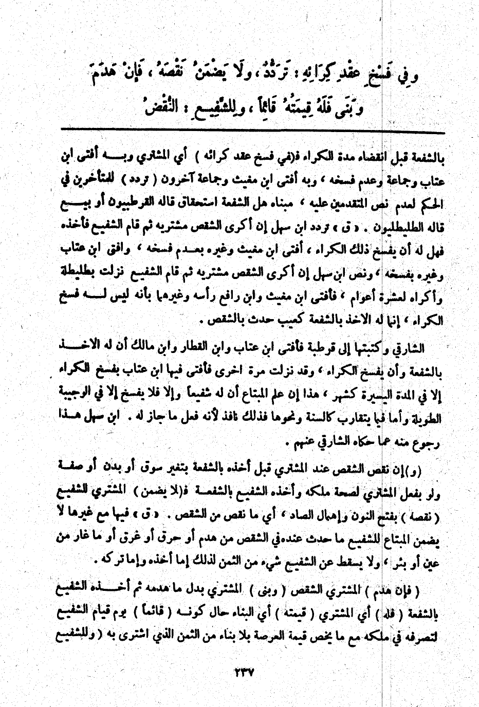 ـــــــــــــــــــــــــــــQبِالشُّفْعَةِ قَبْلَ انْقِضَاءِ مُدَّةِ الْكِرَاءِ فَ (فِي فَسْخِ عَقْدِ كِرَائِهِ) أَيْ الْمُشْتَرِي وَبِهِ أَفْتَى ابْنُ عَتَّابٍ وَجَمَاعَةٌ وَعَدَمِ فَسْخِهِ، وَبِهِ أَفْتَى ابْنُ مُغِيثٍ وَجَمَاعَةٌ آخَرُونَ (تَرَدُّدٌ) لِلْمُتَأَخِّرِينَ فِي الْحُكْمِ لِعَدَمِ نَصِّ الْمُتَقَدِّمِينَ عَلَيْهِ، مَبْنَاهُ هَلْ الشُّفْعَةُ اسْتِحْقَاقٌ قَالَهُ الْقُرْطُبِيُّونَ أَوْ بَيْعٌ قَالَهُ الطُّليْطِليُّونَ. " ق " تَرَدُّدٌ ابْنُ سَهْلٍ إنْ أَكْرَى الشِّقْصَ مُشْتَرِيهِ ثُمَّ قَامَ الشَّفِيعُ فَأَخَذَهُ فَهَلْ لَهُ أَنْ يَفْسَخَ ذَلِكَ الْكِرَاءَ، أَفْتَى ابْنُ مُغِيثٍ وَغَيْرُهُ بِعَدَمِ فَسْخِهِ، وَأَفْتَى ابْنُ عَتَّابٍ وَغَيْرُهُ بِفَسْخِهِ، وَنَصُّ ابْنِ سَهْلٍ إنْ أَكْرَى الشِّقْصَ مُشْتَرِيهِ ثُمَّ قَامَ الشَّفِيعُ نَزَلَتْ بِطُلَيْطِلَةَ وَأَكْرَاهُ لِعَشَرَةِ أَعْوَامٍ، فَأَفْتَى ابْنُ مُغِيثٍ وَابْنُ رَافِعٍ رَأْسَهُ وَغَيْرُهُمَا بِأَنَّهُ لَيْسَ لَهُ فَسْخُ الْكِرَاءِ، إنَّمَا لَهُ الْأَخْذُ بِالشُّفْعَةِ كَعَيْبٍ حَدَثَ بِالشِّقْصِ.