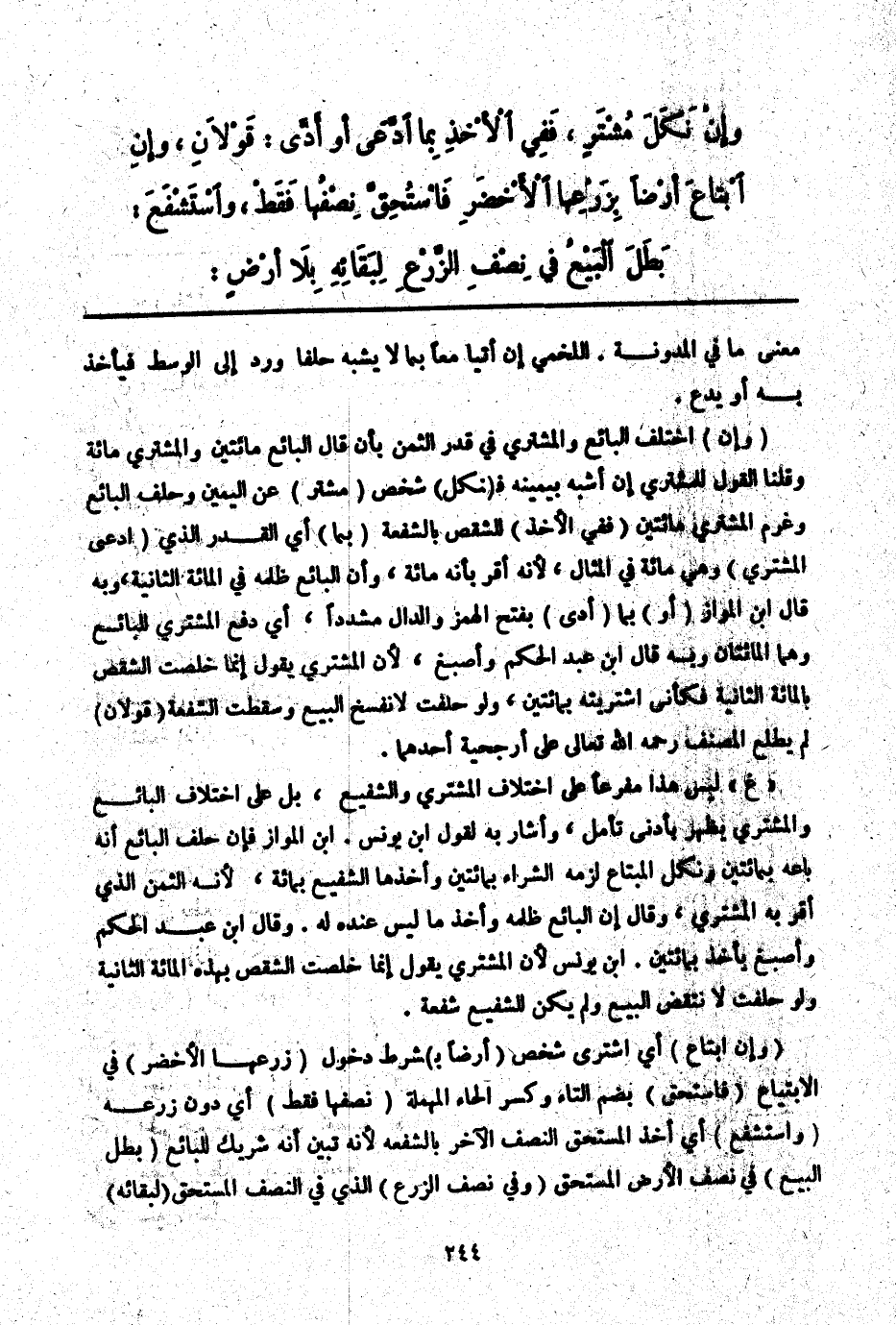 " غ " لَيْسَ هَذَا مُفَرَّعًا عَلَى اخْتِلَافِ الْمُشْتَرِي وَالشَّفِيعِ، بَلْ عَلَى اخْتِلَافِ الْبَائِعِ وَالْمُشْتَرِي يَظْهَرُ بِأَدْنَى تَأَمُّلٍ، وَأَشَارَ بِهِ لِقَوْلِ ابْنِ يُونُسَ. ابْنُ الْمَوَّازِ فَإِنْ حَلَفَ الْبَائِعُ أَنَّهُ بَاعَهُ بِمِائَتَيْنِ وَنَكَلَ الْمُبْتَاعُ لَزِمَهُ الشِّرَاءُ بِمِائَتَيْنِ وَأَخَذَهَا الشَّفِيعُ بِمِائَةٍ لِأَنَّهُ الثَّمَنُ الَّذِي أَقَرَّ بِهِ الْمُشْتَرِي، وَقَالَ إنَّ الْبَائِعَ ظَلَمَهُ وَأَخَذَ مَا لَيْسَ عِنْدَهُ لَهُ. وَقَالَ ابْنُ عَبْدِ الْحَكَمِ وَأَصْبَغُ يَأْخُذُ بِمِائَتَيْنِ. ابْنُ يُونُسَ لِأَنَّ الْمُشْتَرِيَ يَقُولُ إنَّمَا خَلَّصْت الشِّقْصَ بِهَذِهِ الْمِائَةِ الثَّانِيَةِ وَلَوْ حَلَفْت لَانْتَقَضَ الْبَيْعُ وَلَمْ يَكُنْ لِلشَّفِيعِ شُفْعَةٌ.