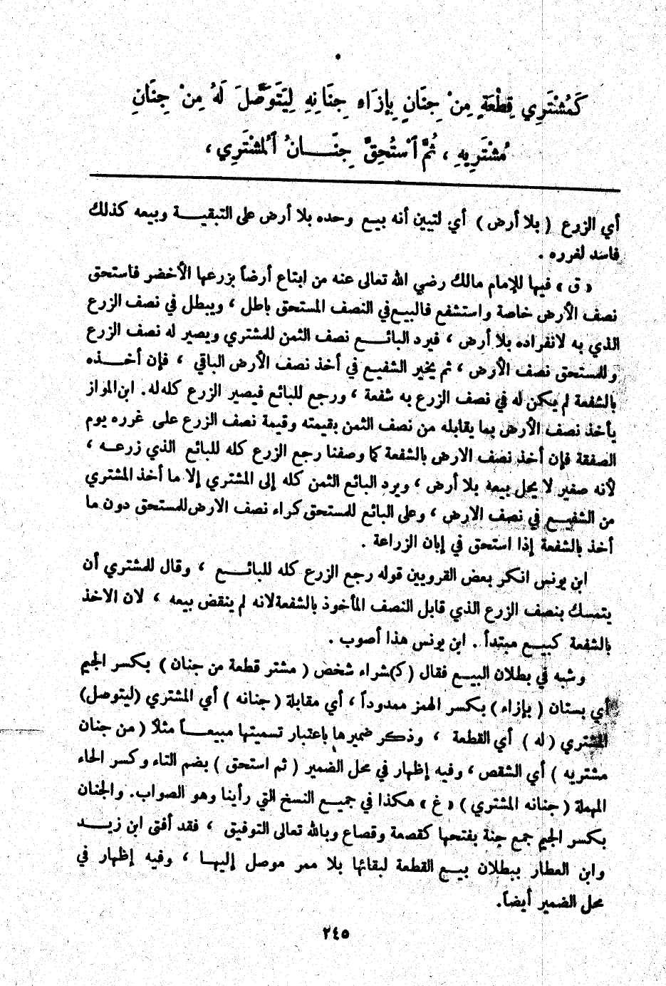 وَشَبَّهَ فِي بُطْلَانِ الْبَيْعِ فَقَالَ (كَ) شِرَاءِ شَخْصٍ (مُشْتَرٍ قِطْعَةً مِنْ جِنَانٍ) بِكَسْرِ الْجِيمِ أَيْ بُسْتَانٍ (بِإِزَاءِ) بِكَسْرِ الْهَمْزِ مَمْدُودًا، أَيْ مُقَابَلَةِ (جِنَانِهِ) أَيْ الْمُشْتَرِي (لِيَتَوَصَّلَ) الْمُشْتَرِي (لَهُ) أَيْ الْقِطْعَةِ، وَذَكَرَ ضَمِيرَهَا بِاعْتِبَارِ تَسْمِيَتِهَا مَبِيعًا مَثَلًا (مِنْ جِنَانِ مُشْتَرِيهِ) أَيْ الشِّقْصِ، وَفِيهِ إظْهَارٌ فِي مَحَلِّ الضَّمِيرِ (ثُمَّ اُسْتُحِقَّ) بِضَمِّ التَّاءِ وَكَسْرِ الْحَاءِ الْمُهْمَلَةِ (جِنَانُ الْمُشْتَرِي) " غ " هَكَذَا فِي جَمِيعِ النُّسَخِ الَّتِي رَأَيْنَا وَهُوَ الصَّوَابُ. وَالْجِنَانُ بِكَسْرِ الْجِيمِ جَمْعُ جَنَّةٍ بِفَتْحِهَا كَقَصْعَةٍ وَقِصَاعٍ وَبِاَللَّهِ تَعَالَى التَّوْفِيقُ، فَقَدْ أَفْتَى ابْنُ زَيْدٍ وَابْنُ الْعَطَّارِ بِبُطْلَانِ بَيْعِ الْقِطْعَةِ لِبَقَائِهَا بِلَا مَمَرٍّ مُوَصِّلٍ إلَيْهَا، وَفِيهِ إظْهَارٌ فِي مَحَلِّ الضَّمِيرِ أَيْضًا.