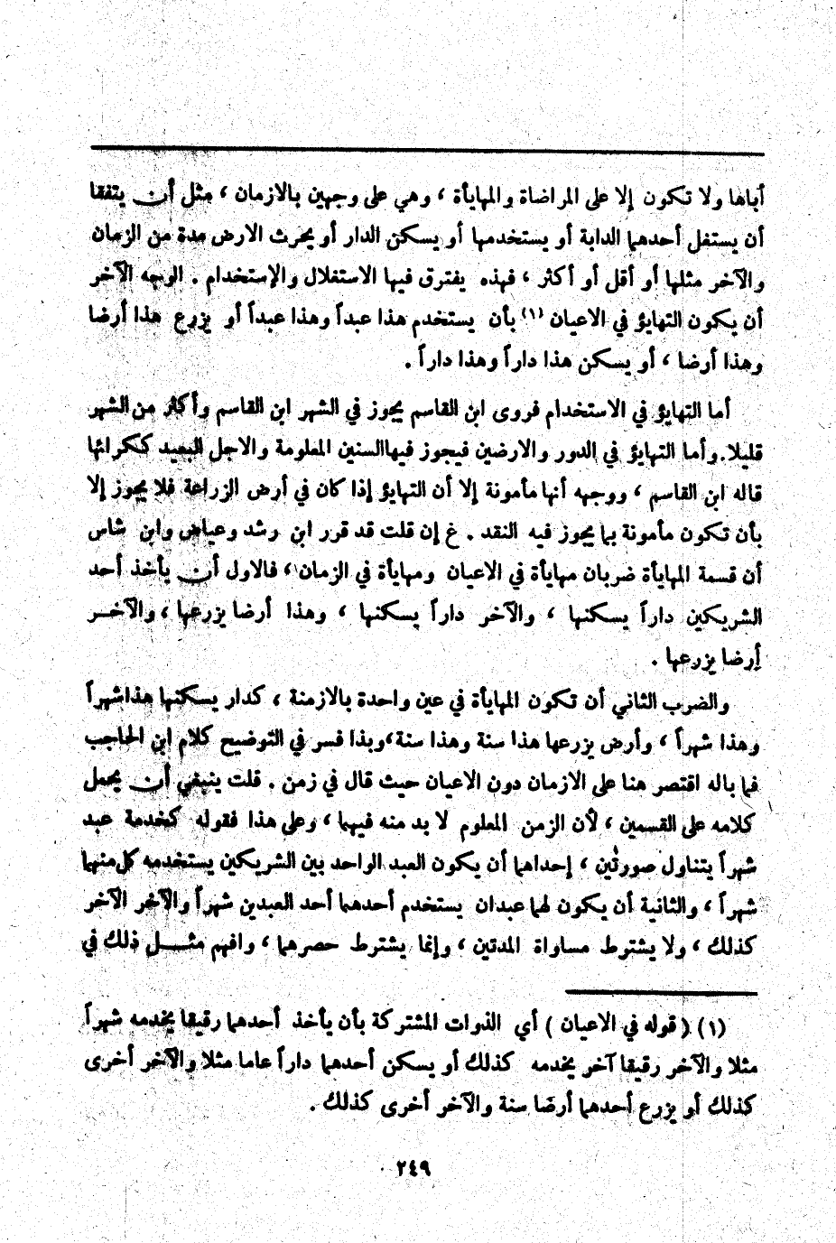 ـــــــــــــــــــــــــــــQأَبَاهَا وَلَا تَكُونُ إلَّا عَلَى الْمُرَاضَاةِ وَالْمُهَايَأَةِ، وَهِيَ عَلَى وَجْهَيْنِ بِالْأَزْمَانِ، مِثْلُ أَنْ يَتَّفِقَا أَنْ يَسْتَغِلَّ أَحَدُهُمَا الدَّابَّةَ أَوْ يَسْتَخْدِمَهَا أَوْ يَسْكُنَ الدَّارَ أَوْ يَحْرُثَ الْأَرْضَ مُدَّةً مِنْ الزَّمَانِ وَالْآخَرُ مِثْلُهَا أَوْ أَقَلُّ أَوْ أَكْثَرُ، فَهَذِهِ يَفْتَرِقُ فِيهَا الِاسْتِغْلَالُ وَالِاسْتِخْدَامُ. الْوَجْهُ الْآخَرُ أَنْ يَكُونَ التَّهَايُؤُ فِي الْأَعْيَانِ بِأَنْ يَسْتَخْدِمَ هَذَا عَبْدًا وَهَذَا عَبْدًا أَوْ يَزْرَعَ هَذَا أَرْضًا وَهَذَا أَرْضًا، أَوْ يَسْكُنَ هَذَا دَارًا وَهَذَا دَارًا.
