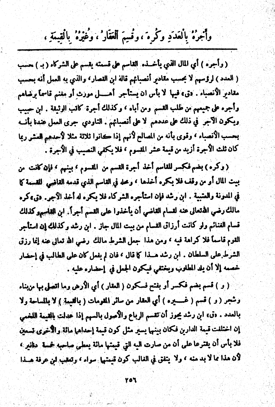 ـــــــــــــــــــــــــــــQ (وَأَجْرُهُ) أَيْ الْمَالِ الَّذِي يَأْخُذُهُ الْقَاسِمُ عَلَى قِسْمَتِهِ يُقْسَمُ عَلَى الشُّرَكَاءِ (بِ) حَسَبِ (الْعَدَدِ) لِرُؤْسِهِمْ لَا بِحَسَبِ مَقَادِيرِ أَنْصِبَائِهِمْ قَالَهُ ابْنُ الْقَصَّارِ، وَاَلَّذِي بِهِ الْعَمَلُ أَنَّهُ بِحَسَبِ مَقَادِيرِ الْأَنْصِبَاءِ. " ق " فِيهَا لَا بَأْسَ أَنْ يَسْتَأْجِرَ أَهْلُ مُوَرِّثٍ أَوْ مَغْنَمٍ قَاسِمًا بِرِضَاهُمْ وَأَجْرُهُ عَلَى جَمِيعِهِمْ مَنْ طَلَبَ الْقَسْمَ وَمَنْ أَبَاهُ، وَكَذَلِكَ أُجْرَةُ كَاتِبِ الْوَثِيقَةِ. ابْنُ حَبِيبٍ وَيَكُونُ الْأَجْرُ فِي ذَلِكَ عَلَى عَدَدِهِمْ لَا عَلَى أَنْصِبَائِهِمْ. التَّاوَدِيُّ جَرَى الْعَمَلُ عِنْدَنَا بِأَنَّهُ بِحَسَبِ الْأَنْصِبَاءِ، وَقَوِيَ بِأَنَّهُ مِنْ الْمَصَالِحِ؛ لِأَنَّهُمْ إذَا كَانُوا ثَلَاثَةً مَثَلًا لِأَحَدِهِمْ الْعُشْرُ رُبَّمَا كَانَ ثُلُثُ الْأُجْرَةِ أَزْيَدَ مِنْ قِيمَةِ عُشْرِ الْمَقْسُومِ، فَلَا يَكْفِي النَّصِيبُ فِي الْأُجْرَةِ.