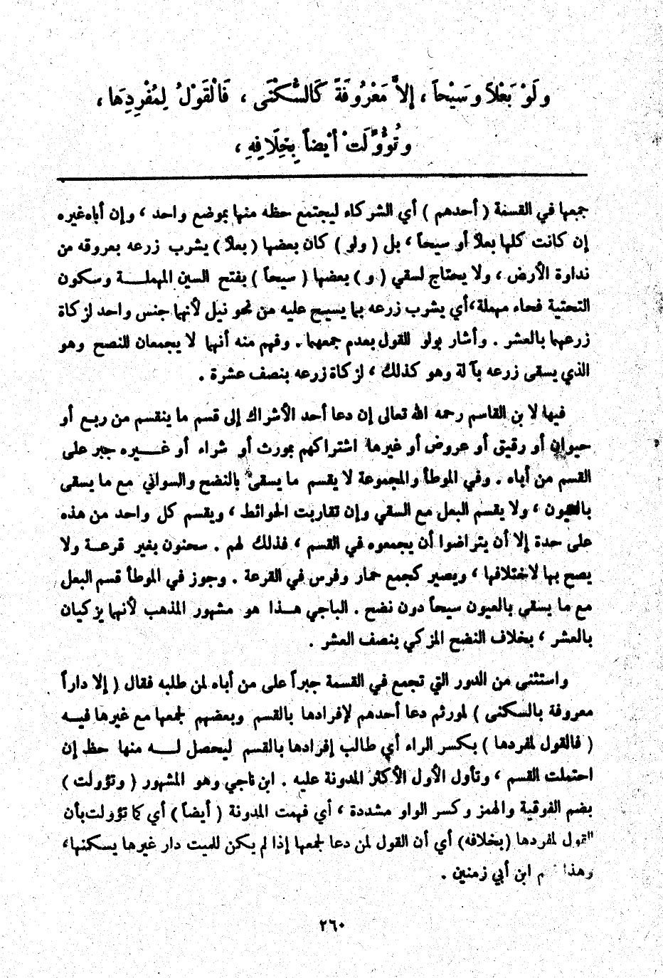 ـــــــــــــــــــــــــــــQجَمَعَهَا فِي الْقِسْمَةِ (أَحَدُهُمْ) أَيْ الشُّرَكَاءِ لِيَجْتَمِعَ حَظُّهُ مِنْهَا بِمَوْضِعٍ وَاحِدٍ، وَإِنْ أَبَاهُ غَيْرُهُ إنْ كَانَتْ كُلُّهَا بَعْلًا أَوْ سَيْحًا، بَلْ (وَلَوْ) كَانَ بَعْضُهَا (بَعْلًا) يَشْرَبُ زَرْعُهُ بِعُرُوقِهِ مِنْ نَدَاوَةِ الْأَرْضِ، لَا يَحْتَاجُ لِسَقْيٍ (وَ) بَعْضُهَا (سَيْحًا) بِفَتْحِ السِّينِ الْمُهْمَلَةِ وَسُكُونِ التَّحْتِيَّةِ فَحَاءٌ مُهْمَلَةٌ، أَيْ يَشْرَبُ زَرْعُهُ بِمَا يَسِيحُ عَلَيْهِ مِنْ نَحْوِ نِيلٍ لِأَنَّهُمَا جِنْسٌ وَاحِدٌ لِزَكَاةِ زَرْعِهِمَا بِالْعُشْرِ. وَأَشَارَ بِوَلَوْ لِلْقَوْلِ بِعَدَمِ جَمْعِهِمَا. وَفُهِمَ مِنْهُ أَنَّهُمَا لَا يُجْمَعَانِ لِلنَّضْحِ وَهُوَ الَّذِي يَسْقِي زَرْعَهُ بِآلَةٍ وَهُوَ كَذَلِكَ، لِزَكَاةِ زَرْعِهِ بِنِصْفِ عُشْرِهِ. فِيهَا لِابْنِ الْقَاسِمِ - رَحِمَهُ اللَّهُ تَعَالَى - إنْ دَعَا أَحَدُ الْأَشْرَاكِ إلَى قَسْمِ مَا يَنْقَسِمُ مِنْ رَبْعٍ أَوْ حَيَوَانٍ أَوْ رَقِيقٍ أَوْ عُرُوضٍ أَوْ غَيْرِهَا اشْتِرَاكُهُمْ بِمُوَرِّثٍ أَوْ شِرَاءٍ أَوْ غَيْرِهِ جُبِرَ عَلَى الْقَسْمِ مَنْ أَبَاهُ. وَفِي الْمُوَطَّإِ وَالْمَجْمُوعَةِ لَا يُقْسَمُ مَا يُسْقَى بِالنَّضْحِ وَالسَّوَانِي مَعَ مَا يُسْقَى بِالْعُيُونِ، وَلَا يُقْسَمُ الْبَعْلُ مَعَ السَّقْيِ وَإِنْ تَقَارَبَتْ الْحَوَائِطُ، وَيُقْسَمُ كُلُّ وَاحِدٍ مِنْ هَذِهِ عَلَى حِدَةٍ إلَّا أَنْ يَتَرَاضَوْا أَنْ يَجْمَعُوهُ فِي الْقَسْمِ، فَذَلِكَ لَهُمْ. سَحْنُونٌ بِغَيْرِ قُرْعَةٍ وَلَا يَصِحُّ بِهَا لِاخْتِلَافِهَا، وَيَصِيرُ كَجَمْعِ حِمَارٍ وَفَرَسٍ فِي الْقُرْعَةِ. وَجَوَّزَ فِي الْمُوَطَّإِ قَسْمَ الْبَعْلِ مَعَ مَا يُسْقَى بِالْعُيُونِ سَيْحًا دُونَ نَضْحٍ. الْبَاجِيَّ هَذَا هُوَ مَشْهُورُ الْمَذْهَبِ لِأَنَّهُمَا يُزَكَّيَانِ بِالْعُشْرِ، بِخِلَافِ النَّضْحِ الْمُزَكَّى بِنِصْفِ الْعُشْرِ.