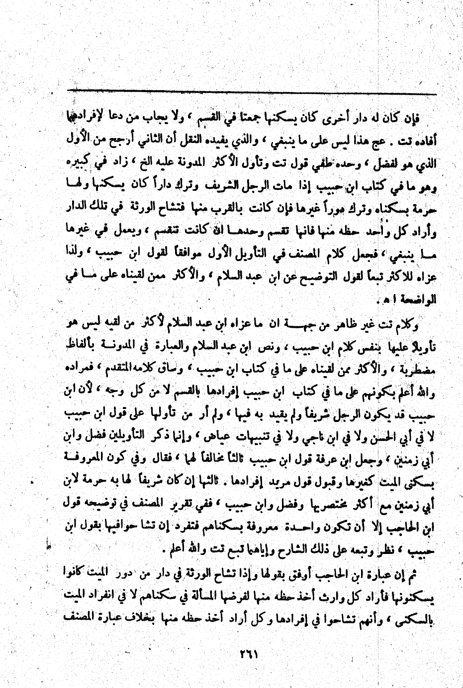 وَكَلَامُ تت غَيْرُ ظَاهِرٍ مِنْ جِهَةِ أَنَّ مَا عَزَاهُ ابْنُ عَبْدِ السَّلَامِ لِأَكْثَرَ مَنْ لَقِيَهُ لَيْسَ هُوَ تَأْوِيلًا عَلَيْهَا بِنَفْسِ كَلَامِ ابْنِ حَبِيبٍ، وَنَصُّ ابْنِ عَبْدِ السَّلَامِ وَالْعِبَارَةُ فِي الْمُدَوَّنَةِ بِأَلْفَاظٍ مُضْطَرِبَةٍ، وَالْأَكْثَرُ مِمَّنْ لَقِينَاهُ عَلَى مَا فِي كِتَابِ ابْنِ حَبِيبٍ، وَسَاقَ كَلَامَهُ الْمُتَقَدِّمَ، فَمُرَادُهُ وَاَللَّهُ أَعْلَمُ بِكَوْنِهِمْ عَلَى مَا فِي كِتَابِ ابْنِ حَبِيبٍ إفْرَادُهَا بِالْقَسْمِ لَا مِنْ كُلِّ وَجْهٍ لِأَنَّ ابْنَ حَبِيبٍ قَدْ يَكُونُ الرَّجُلُ شَرِيفًا وَلَمْ يُقَيَّدْ بِهِ فِيهَا، وَلَمْ أَرَ مَنْ تَأَوَّلَهَا عَلَى قَوْلِ ابْنِ حَبِيبٍ لَا فِي أَبِي الْحَسَنِ وَلَا فِي ابْنِ نَاجِي وَلَا فِي تَنْبِيهَاتِ عِيَاضٍ، وَإِنَّمَا ذَكَرَ التَّأْوِيلَيْنِ فَضْلٌ وَابْنُ أَبِي زَمَنِينَ، وَجَعَلَ ابْنُ عَرَفَةَ قَوْلَ ابْنِ حَبِيبٍ ثَالِثًا مُخَالِفًا لَهُمَا، فَقَالَ وَفِي كَوْنِ الْمَعْرُوفَةِ بِسُكْنَى الْمَيِّتِ كَغَيْرِهَا وَقَبُولُ قَوْلِ مُرِيدِ إفْرَادِهَا. ثَالِثُهَا إنْ كَانَ شَرِيفًا لَهَا بِهِ حُرْمَةٌ لِابْنِ أَبِي زَمَنِينَ مَعَ أَكْثَرِ مُخْتَصِرِيهَا وَفَضْلٍ وَابْنِ حَبِيبٍ، فَفِي تَقْرِيرِ الْمُصَنِّفِ فِي تَوْضِيحِهِ قَوْلَ ابْنِ الْحَاجِبِ إلَّا أَنْ تَكُونَ وَاحِدَةً مَعْرُوفَةً بِسُكْنَاهُمْ فَتُفْرَدُ إنْ تَشَاحُّوا فِيهَا بِقَوْلِ ابْنِ حَبِيبٍ، نَظَرٌ وَتَبِعَهُ عَلَى ذَلِكَ الشَّارِحُ وَإِيَّاهُمَا تَبِعَ تت وَاَللَّهُ أَعْلَمُ. ثُمَّ إنَّ عِبَارَةَ ابْنِ الْحَاجِبِ أَوْفَقُ بِقَوْلِهَا وَإِذَا تَشَاحَّ الْوَرَثَةُ فِي دَارٍ مِنْ دُورِ الْمَيِّتِ كَانُوا يَسْكُنُونَهَا فَأَرَادَ كُلُّ وَارِثٍ أَخْذَ حَظِّهِ مِنْهَا لِفَرْضِهَا الْمَسْأَلَةَ فِي سُكْنَاهُمْ لَا فِي انْفِرَادِ الْمَيِّتِ بِالسُّكْنَى، وَأَنَّهُمْ تَشَاحُّوا فِي إفْرَادِهَا وَكُلٌّ أَرَادَ أَخْذَ حَظِّهِ مِنْهَا بِخِلَافِ عِبَارَةِ الْمُصَنِّفِ