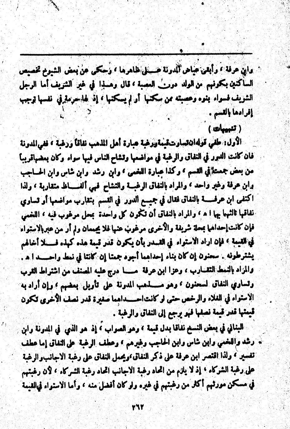(تَنْبِيهَاتٌ) الْأَوَّلُ: طفي قَوْلُهُ إنْ تَسَاوَتْ قِيمَةً وَرَغْبَةً عِبَارَةُ أَهْلِ الْمَذْهَبِ نَفَاقًا وَرَغْبَةً، فَفِي الْمُدَوَّنَةِ فَإِنْ كَانَتْ الدُّورُ فِي النَّفَاقِ وَالرَّغْبَةِ فِي مَوَاضِعِهَا وَتَشَاحِّ النَّاسِ فِيهَا سَوَاءً، وَكَانَ بَعْضُهَا قَرِيبًا مِنْ بَعْضٍ جُمِعَتْ فِي الْقَسْمِ، وَكَذَا عِبَارَةُ اللَّخْمِيِّ وَابْنِ رُشْدٍ وَابْنِ شَاسٍ وَابْنِ الْحَاجِبِ وَابْنِ عَرَفَةَ وَغَيْرِ وَاحِدٍ، وَالْمُرَادُ بِالنَّفَاقِ الرَّغْبَةُ وَالتَّشَاحُّ فَهِيَ أَلْفَاظٌ مُتَقَارِبَةٌ، وَلِذَا اكْتَفَى ابْنُ عَرَفَةَ بِالنَّفَاقِ فَقَالَ فِي جَمِيعِ الدُّورِ فِي الْقَسْمِ بِتَقَارُبِ مَوَاضِعِهَا أَوْ تَسَاوِي نَفَاقِهَا ثَالِثُهُمَا بِهِمَا. اهـ.