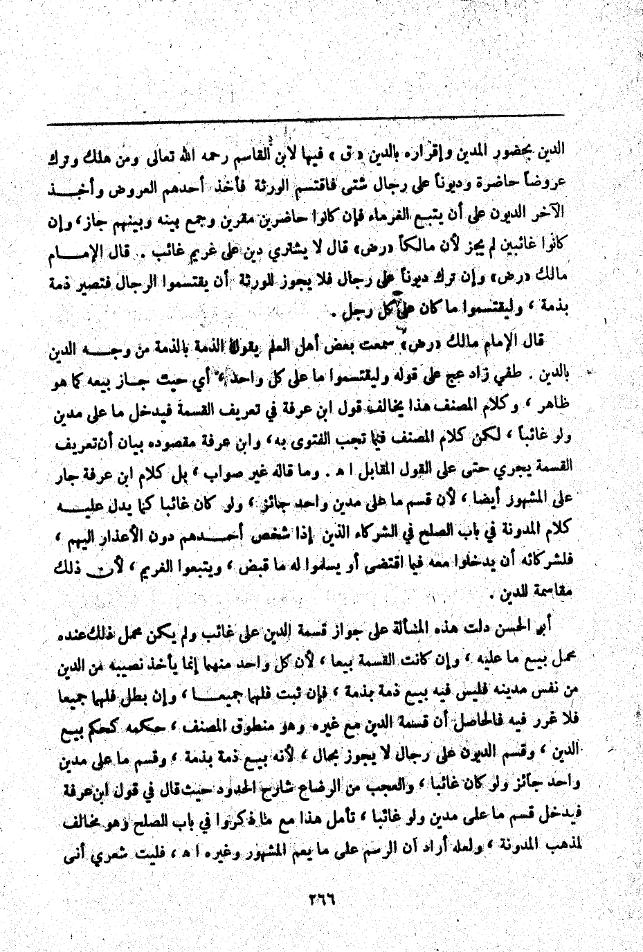 ـــــــــــــــــــــــــــــQالدَّيْنِ بِحُضُورِ الْمَدِينِ وَإِقْرَارُهُ بِالدَّيْنِ " ق ". فِيهَا لِابْنِ الْقَاسِمِ - رَحِمَهُ اللَّهُ تَعَالَى - وَمَنْ هَلَكَ وَتَرَكَ عُرُوضًا حَاضِرَةً وَدُيُونًا عَلَى رِجَالٍ شَتَّى فَاقْتَسَمَ الْوَرَثَةُ فَأَخَذَ أَحَدُهُمْ الْعُرُوضَ وَأَخَذَ الْآخَرُ الدُّيُونَ عَلَى أَنْ يَتْبَعَ الْغُرَمَاءَ فَإِنْ كَانُوا حَاضِرِينَ مُقِرِّينَ وَجُمِعَ بَيْنَهُ وَبَيْنَهُمْ جَازَ، وَإِنْ كَانُوا غَائِبِينَ لَمْ يَجُزْ لِأَنَّ مَالِكًا " - رَضِيَ اللَّهُ عَنْهُ - " قَالَ لَا يُشْتَرَى دَيْنٌ عَلَى غَرِيمٍ غَائِبٍ. قَالَ الْإِمَامُ مَالِكٌ " - رَضِيَ اللَّهُ عَنْهُ - " وَإِنْ تَرَكَ دُيُونًا عَلَى رِجَالٍ فَلَا يَجُوزُ لِلْوَرَثَةِ أَنْ يَقْتَسِمُوا الرِّجَالَ فَتَصِيرُ ذِمَّةً بِذِمَّةٍ، وَلْيَقْتَسِمُوا مَا كَانَ عَلَى كُلِّ رَجُلٍ.