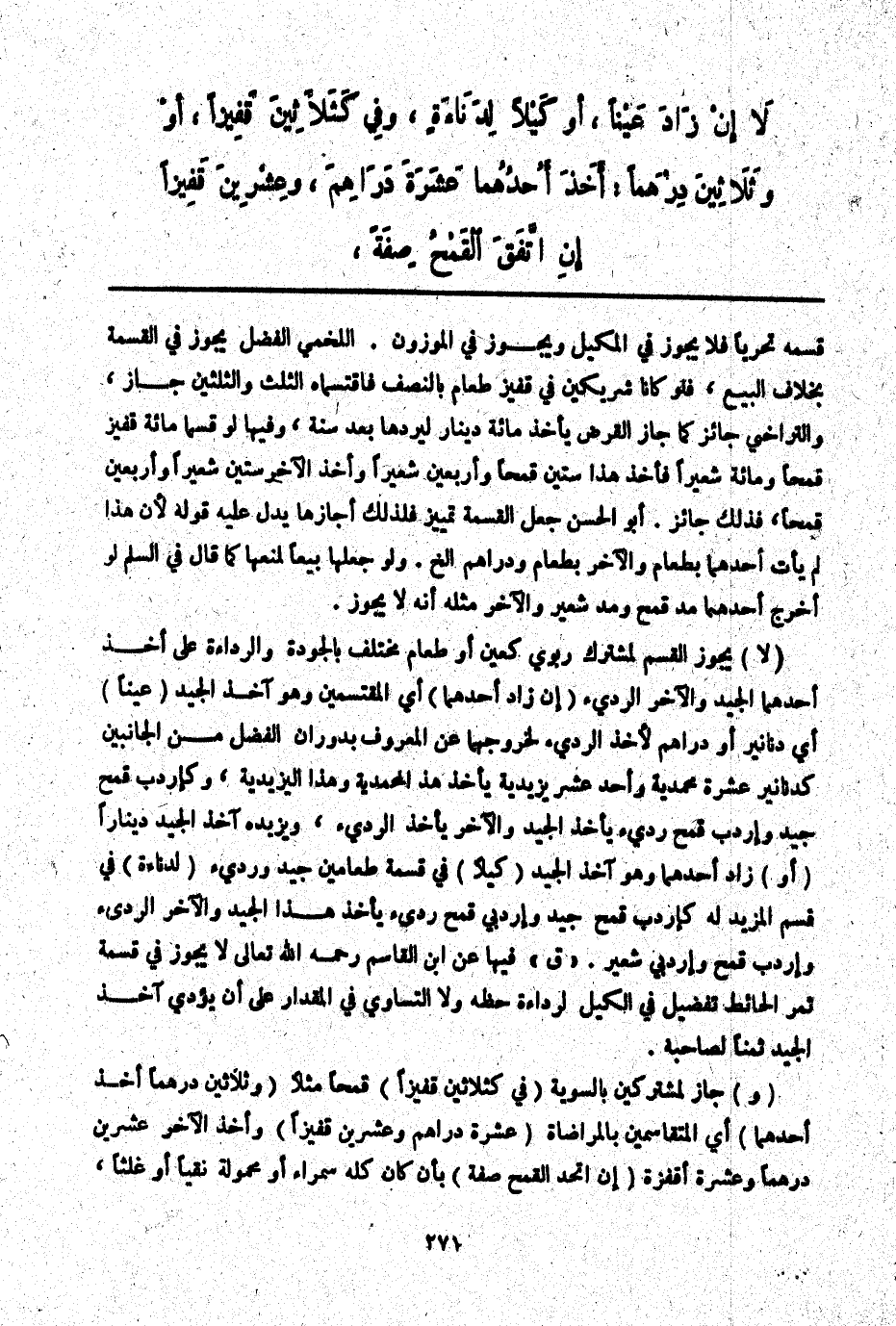(لَا) يَجُوزُ الْقَسْمُ لِمُشْتَرَكٍ رِبَوِيٍّ كَعَيْنٍ أَوْ طَعَامٍ مُخْتَلِفٍ بِالْجَوْدَةِ وَالرَّدَاءَةِ عَلَى أَخْذِ أَحَدِهِمَا الْجَيِّدَ وَالْآخَرِ الرَّدِيءَ (إنْ زَادَ أَحَدُهُمَا) أَيْ الْمُقْسِمِينَ وَهُوَ آخِذُ الْجَيِّدِ (عَيْنًا) أَيْ دَنَانِيرَ أَوْ دَرَاهِمَ لِأَخْذِ الرَّدِيءِ لِخُرُوجِهِمَا عَنْ الْمَعْرُوفِ بِدَوَرَانِ الْفَضْلِ مِنْ الْجَانِبَيْنِ كَدَنَانِيرَ عَشَرَةٍ مُحَمَّدِيَّةٍ وَأَحَدَ عَشَرَ يَزِيدِيَّةً يَأْخُذُ هَذَا الْمُحَمَّدِيَّةَ وَهَذَا الْيَزِيدِيَّةَ، وَكَإِرْدَبِّ قَمْحٍ جَيِّدٍ وَإِرْدَبِّ قَمْحٍ رَدِيءٍ يَأْخُذُ الْجَيِّدَ وَالْآخَرُ يَأْخُذُ الرَّدِيءَ، وَيَزِيدُهُ آخِذُ الْجَيِّدِ دِينَارًا (أَوْ) زَادَ أَحَدُهُمَا وَهُوَ آخِذُ الْجَيِّدِ (كَيْلًا) فِي قِسْمَةِ طَعَامَيْنِ جَيِّدٍ وَرَدِيءٍ (لِدَنَاءَةٍ) فِي قَسْمِ الْمَزِيدِ لَهُ كَإِرْدَبِّ قَمْحٍ جَيِّدٍ وَإِرْدَبَّيْ قَمْحٍ رَدِيءٍ يَأْخُذُ هَذَا الْجَيِّدَ وَالْآخَرُ الرَّدِيءَ وَإِرْدَبِّ قَمْحٍ وَإِرْدَبَّيْ شَعِيرٍ. " ق " فِيهَا عَنْ ابْنِ الْقَاسِمِ - رَحِمَهُ اللَّهُ تَعَالَى - لَا يَجُوزُ فِي قِسْمَةِ ثَمَرِ الْحَائِطِ تَفْضِيلٌ فِي الْكَيْلِ لِرَدَاءَةِ حَظِّهِ وَلَا التَّسَاوِي فِي الْمِقْدَارِ عَلَى أَنْ يُؤَدِّيَ آخِذُ الْجَيِّدِ ثَمَنًا لِصَاحِبِهِ.