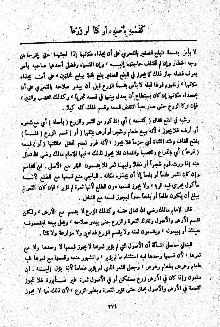وَشَبَّهَ فِي الْمَنْعِ فَقَالَ (كَقَسْمِهِ) أَيْ الْمَذْكُورِ مِنْ الثَّمَرِ وَالزَّرْعِ (بِأَصْلِهِ) أَيْ مَعَ شَجَرِهِ أَوْ أَرْضِهِ فَلَا يَجُوزُ لِأَنَّهُ بَيْعُ طَعَامٍ وَشَجَرٍ أَوْ أَرْضٍ بِمِثْلِهِمَا (أَوْ) قَسْمُ الزَّرْعِ (قَتًّا) بِفَتْحِ الْقَافِ وَشَدِّ الْمُثَنَّاةِ أَيْ جَزْمًا فَلَا يَجُوزُ لِأَنَّهُ غَرَرٌ لِعَدَمِ تَحَقُّقِ مُمَاثَلَتِهَا (أَوْ) قَسْمُهُ (ذَرْعًا) أَيْ بِالذِّرَاعِ وَالْقَصَبَةِ وَالْفَدَّانِ فَلَا يَجُوزُ لِذَلِكَ، فِيهَا لِلْإِمَامِ مَالِكٌ - رَضِيَ اللَّهُ تَعَالَى عَنْهُ - إذَا وَرِثَ قَوْمٌ شَجَرًا أَوْ نَخْلًا وَفِيهَا ثَمَرٌ فَلَا يَقْسِمُونَ الثِّمَارَ مَعَ الْأَصْلِ. ابْنُ الْقَاسِمِ وَإِنْ كَانَ الثَّمَرُ طَلْعًا أَوْ بَلَحًا إلَّا أَنْ يَجُذُّوهُ مَكَانَهُ. الْبَاجِيَّ مَنَعَ قَسْمَهَا مَعَ الطَّلْعِ لِأَنَّهُ مَأْكُولٌ يَجْرِي فِيهِ الرِّبَا، وَلَا يَجُوزُ قَسْمُهَا دُونَ الطَّلْعِ لِأَنَّهَا ثَمَرَةٌ لَمْ تُؤَبَّرْ، فَإِنْ كَانَ الثَّمَرُ لَمْ يَبْلُغْ أَنْ يَكُونَ طَلْعًا أَوْ بَلَحًا حُلْوًا فَيَجُوزُ قَسْمُهُ مَعَ النَّخْلِ. قَالَ الْإِمَامُ مَالِكٌ - رَضِيَ اللَّهُ تَعَالَى عَنْهُ - وَكَذَلِكَ الزَّرْعُ لَا يُقْسَمُ مَعَ الْأَرْضِ، وَلَكِنْ تُقْسَمُ الْأَرْضُ وَالْأُصُولُ وَتُتْرَكُ الثَّمَرَةُ وَالزَّرْعُ حَتَّى يَبْدُوَ صَلَاحُهُ، وَيَحِلُّ بَيْعُهُ فَيَقْسِمُونَهُ حِينَئِذٍ أَوْ يَبِيعُونَهُ، وَيَقْسِمُونَ ثَمَنَهُ وَلَا يُقْسَمُ الزَّرْعُ فَدَادِينَ وَلَا مُزَارَعَةً وَلَا قَتًّا.