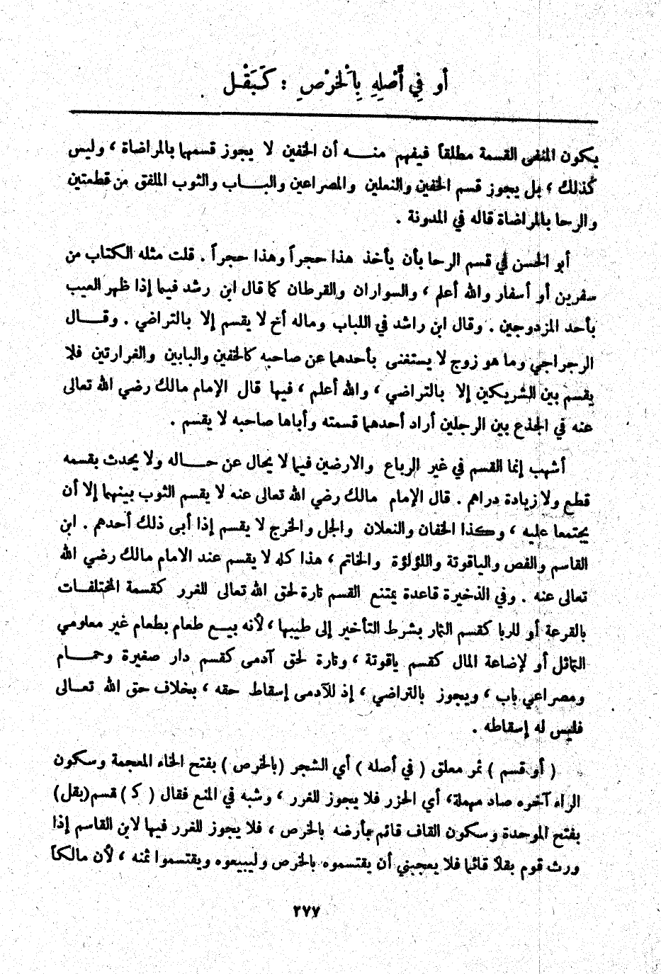 ـــــــــــــــــــــــــــــQيَكُونَ الْمَنْفِيُّ الْقِسْمَةَ مُطْلَقًا فَيُفْهَمُ مِنْهُ أَنَّ الْخُفَّيْنِ لَا يَجُوزُ قَسْمُهُمَا بِالْمُرَاضَاةِ، وَلَيْسَ كَذَلِكَ، بَلْ يَجُوزُ قَسْمُ الْخُفَّيْنِ وَالنَّعْلَيْنِ وَالْمِصْرَاعَيْنِ وَالْبَابِ وَالثَّوْبِ الْمُلَفَّقِ مِنْ قِطْعَتَيْنِ وَالرَّحَى بِالْمُرَاضَاةِ قَالَهُ فِي الْمُدَوَّنَةِ. أَبُو الْحَسَنِ فِي قَسْمِ الرَّحَى بِأَنْ يَأْخُذَ هَذَا حَجَرًا وَهَذَا حَجَرًا. قُلْت مِثْلُهُ الْكِتَابُ مِنْ سِفْرَيْنِ أَوْ أَسْفَارٍ وَاَللَّهُ أَعْلَمُ، وَالسِّوَارَانِ وَالْقُرْطَانِ كَمَا قَالَ ابْنُ رُشْدٍ فِيمَا إذَا ظَهَرَ الْعَيْبُ بِأَحَدِ الْمُزْدَوِجَيْنِ. وَقَالَ ابْنُ رَاشِدٍ فِي اللُّبَابِ وَمَا لَهُ أَخٌ لَا يُقْسَمُ إلَّا بِالتَّرَاضِي. وَقَالَ الرَّجْرَاجِيُّ وَمَا هُوَ زَوْجٌ لَا يُسْتَغْنَى بِأَحَدِهِمَا عَنْ صَاحِبِهِ كَالْخُفَّيْنِ وَالْبَابَيْنِ وَالْغِرَارَتَيْنِ فَلَا يُقْسَمُ بَيْنَ الشَّرِيكَيْنِ إلَّا بِالتَّرَاضِي، وَاَللَّهُ أَعْلَمُ، فِيهَا قَالَ الْإِمَام مَالِكٌ - رَضِيَ اللَّهُ تَعَالَى عَنْهُ - فِي الْجِذْعِ بَيْنَ الرَّجُلَيْنِ أَرَادَ أَحَدُهُمَا قِسْمَتَهُ وَأَبَاهَا صَاحِبُهُ لَا يُقْسَمُ. أَشْهَبُ إنَّمَا الْقَسْمُ فِي غَيْرِ الرُّبَاعِ وَالْأَرَضِينَ فِيمَا لَا يُحَالُ عَنْ حَالِهِ وَلَا يَحْدُثُ بِقَسْمِهِ قَطْعٌ وَلَا زِيَادَةُ دَرَاهِمَ. قَالَ الْإِمَامُ مَالِكٌ - رَضِيَ اللَّهُ تَعَالَى عَنْهُ - لَا يُقْسَمُ الثَّوْبُ بَيْنَهُمَا إلَّا أَنْ يَجْتَمِعَا عَلَيْهِ، وَكَذَا الْخُفَّانِ وَالنَّعْلَانِ وَالْجَلُّ وَالْخُرْجُ لَا يُقْسَمُ إذَا أَبَى ذَلِكَ أَحَدُهُمْ. ابْنُ الْقَاسِمِ وَالْفَصُّ وَالْيَاقُوتَةُ وَاللُّؤْلُؤَةُ وَالْخَاتَمُ، هَذَا كُلُّهُ لَا يُقْسَمُ عِنْدَ الْإِمَامِ مَالِكٍ - رَضِيَ اللَّهُ تَعَالَى عَنْهُ -. وَفِي الذَّخِيرَةِ قَاعِدَةٌ يَمْتَنِعُ الْقَسْمُ تَارَةً لِحَقِّ اللَّهِ تَعَالَى لِلْغَرَرِ كَقِسْمَةِ الْمُخْتَلِفَاتِ بِالْقُرْعَةِ أَوْ لِلرِّبَا كَقَسْمِ الثِّمَارِ بِشَرْطِ التَّأْخِيرِ إلَى طِيبِهَا لِأَنَّهُ بَيْعُ طَعَامٍ بِطَعَامٍ غَيْرِ مَعْلُومَيْ التَّمَاثُلِ أَوْ لِإِضَاعَةِ الْمَالِ كَقَسْمِ يَاقُوتَةٍ، وَتَارَةٍ لِحَقِّ آدَمِيٍّ كَقَسْمِ دَارٍ صَغِيرَةٍ وَحَمَّامٍ وَمِصْرَاعَيْ بَابٍ، وَيَجُوزُ بِالتَّرَاضِي إذْ لِلْآدَمِيِّ إسْقَاطُ حَقِّهِ، بِخِلَافِ حَقِّ اللَّهِ تَعَالَى فَلَيْسَ لَهُ إسْقَاطُهُ.