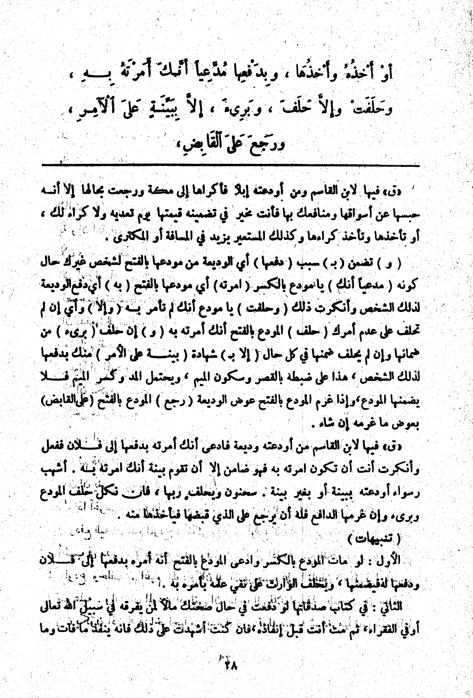(وَ) تُضْمَنُ (بِ) سَبَبِ (دَفْعِهَا) أَيْ الْوَدِيعَةِ مِنْ مُودَعِهَا بِالْفَتْحِ لِشَخْصٍ غَيْرِكَ حَالَ كَوْنِهِ (مُدَّعِيًا أَنَّكَ) يَا مُودِعُ بِالْكَسْرِ (أَمَرْتَهُ) أَيْ مُودَعَهَا بِالْفَتْحِ (بِهِ) أَيْ دَفْعِ الْوَدِيعَةِ لِذَلِكَ الشَّخْصِ وَأَنْكَرْتَ ذَلِكَ (وَحَلَفْتَ) يَا مُودِعُ أَنَّك لَمْ تَأْمُرْ بِهِ (وَإِلَّا) وَأَيْ إنْ لَمْ تَحْلِفْ عَلَى عَدَمِ أَمْرِك (حَلَفَ) الْمُودَعُ بِالْفَتْحِ أَنَّك أَمَرْتَهُ بِهِ (وَ) إنْ حَلَفَ (بَرِئَ) مِنْ ضَمَانِهَا وَإِنْ لَمْ يَحْلِفْ ضَمِنَهَا فِي كُلِّ حَالٍ (إلَّا بِ) شَهَادَةٍ (بَيِّنَةٍ عَلَى الْأَمْرِ) مِنْك بِدَفْعِهَا لِذَلِكَ الشَّخْصِ، هَذَا عَلَى ضَبْطِهِ بِالْقَصْرِ وَسُكُونِ الْمِيمِ، وَيُحْتَمَلُ الْمَدُّ وَكَسْرِ الْمِيمِ فَلَا يَضْمَنُهَا الْمُودَعُ، وَإِذَا غَرِمَ الْمُودَعُ بِالْفَتْحِ عِوَضَ الْوَدِيعَةِ (رَجَعَ) الْمُودَعُ بِالْفَتْحِ (عَلَى الْقَابِضِ) بِعِوَضِ مَا غَرِمَهُ إنْ شَاءَ. " ق " فِيهَا لِابْنِ الْقَاسِمِ مَنْ أَوْدَعْته وَدِيعَةً فَادَّعَى أَنَّك أَمَرْته بِدَفْعِهَا إلَى فُلَانٍ فَفَعَلَ وَأَنْكَرْت أَنْتَ أَنْ تَكُونَ أَمَرْتَهُ بِهِ فَهُوَ ضَامِنٌ إلَّا أَنْ تَقُومَ بَيِّنَةٌ أَنَّكَ أَمَرْتَهُ بِهِ. أَشْهَبُ وَسَوَاءٌ أَوْدَعْتَهُ بِبَيِّنَةٍ أَوْ بِغَيْرِ بَيِّنَةٍ. سَحْنُونٌ وَيَحْلِفُ رَبُّهَا، فَإِنْ نَكَلَ حَلَفَ الْمُودَعُ وَبَرِئَ وَإِنْ غَرِمَهَا الدَّافِعُ فَلَهُ أَنْ يَرْجِعَ عَلَى الَّذِي قَبَضَهَا فَيَأْخُذَهَا مِنْهُ.