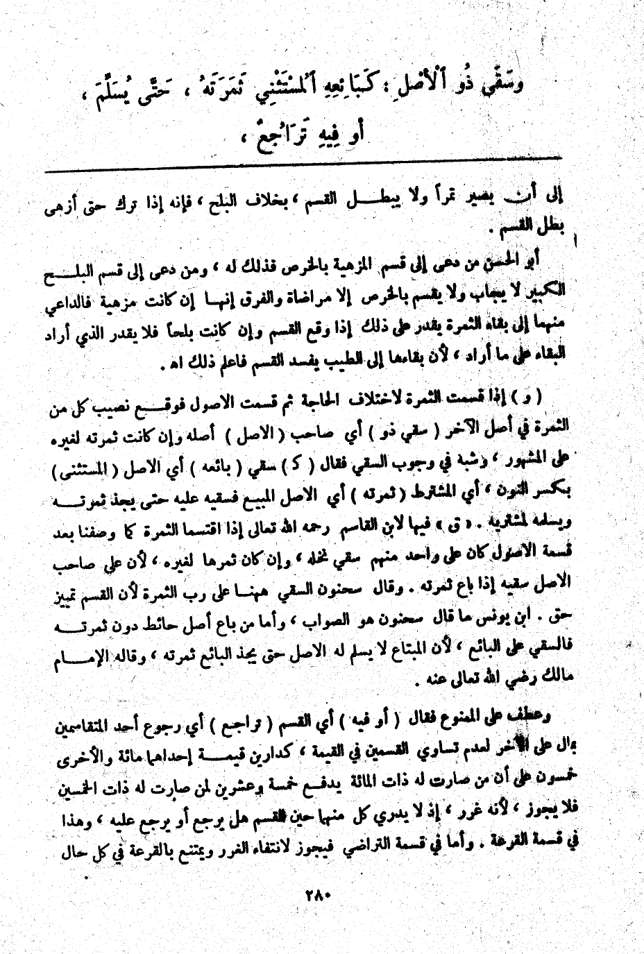 (وَ) إذَا قُسِمَتْ الثَّمَرَةُ لِاخْتِلَافِ الْحَاجَةِ ثُمَّ قُسِمَتْ الْأُصُولُ فَوَقَعَ نَصِيبُ كُلٍّ مِنْ الثَّمَرَةِ فِي أَصْلِ الْآخَرِ (سَقَى ذُو) أَيْ صَاحِبُ (الْأَصْلِ) أَصْلَهُ وَإِنْ كَانَتْ ثَمَرَتُهُ لِغَيْرِهِ عَلَى الْمَشْهُورِ، وَشَبَّهَ فِي وُجُوبِ السَّقْيِ فَقَالَ (كَ) سَقْيِ (بَائِعِهِ) أَيْ الْأَصْلِ (الْمُسْتَثْنِي) بِكَسْرِ النُّونِ، أَيْ الْمُشْتَرِطِ (ثَمَرَتَهُ) أَيْ الْأَصْلِ الْمَبِيعِ فَسَقْيُهُ عَلَيْهِ حَتَّى يَجُذَّ ثَمَرَتَهُ وَيُسَلِّمَهُ لِمُشْتَرِيهِ. " ق " فِيهَا لِابْنِ الْقَاسِمِ - رَحِمَهُ اللَّهُ تَعَالَى - إذَا اقْتَسَمَا الثَّمَرَةَ كَمَا وَصَفْنَا بَعْدَ قِسْمَةِ الْأُصُولِ كَانَ عَلَى وَاحِدٍ مِنْهُمْ سَقْيُ نَخْلَةٍ، وَإِنْ كَانَ ثَمَرُهَا لِغَيْرِهِ لِأَنَّ عَلَى صَاحِبِ الْأَصْلِ سَقْيُهُ إذَا بَاعَ ثَمَرَتَهُ. وَقَالَ سَحْنُونٌ السَّقْيُ هَاهُنَا عَلَى رَبِّ الثَّمَرَةِ لِأَنَّ الْقَسْمَ تَمْيِيزُ حَقٍّ. ابْنُ يُونُسَ مَا قَالَ سَحْنُونٌ هُوَ الصَّوَابُ، وَأَمَّا مَنْ بَاعَ أَصْلَ حَائِطٍ دُونَ ثَمَرَتِهِ فَالسَّقْيُ عَلَى الْبَائِعِ لِأَنَّ الْمُبْتَاعَ لَا يُسَلِّمُ لَهُ الْأَصْلَ حَتَّى يَجُذَّ الْبَائِعُ ثَمَرَتَهُ، وَقَالَهُ الْإِمَامُ مَالِكٌ - رَضِيَ اللَّهُ تَعَالَى عَنْهُ -.