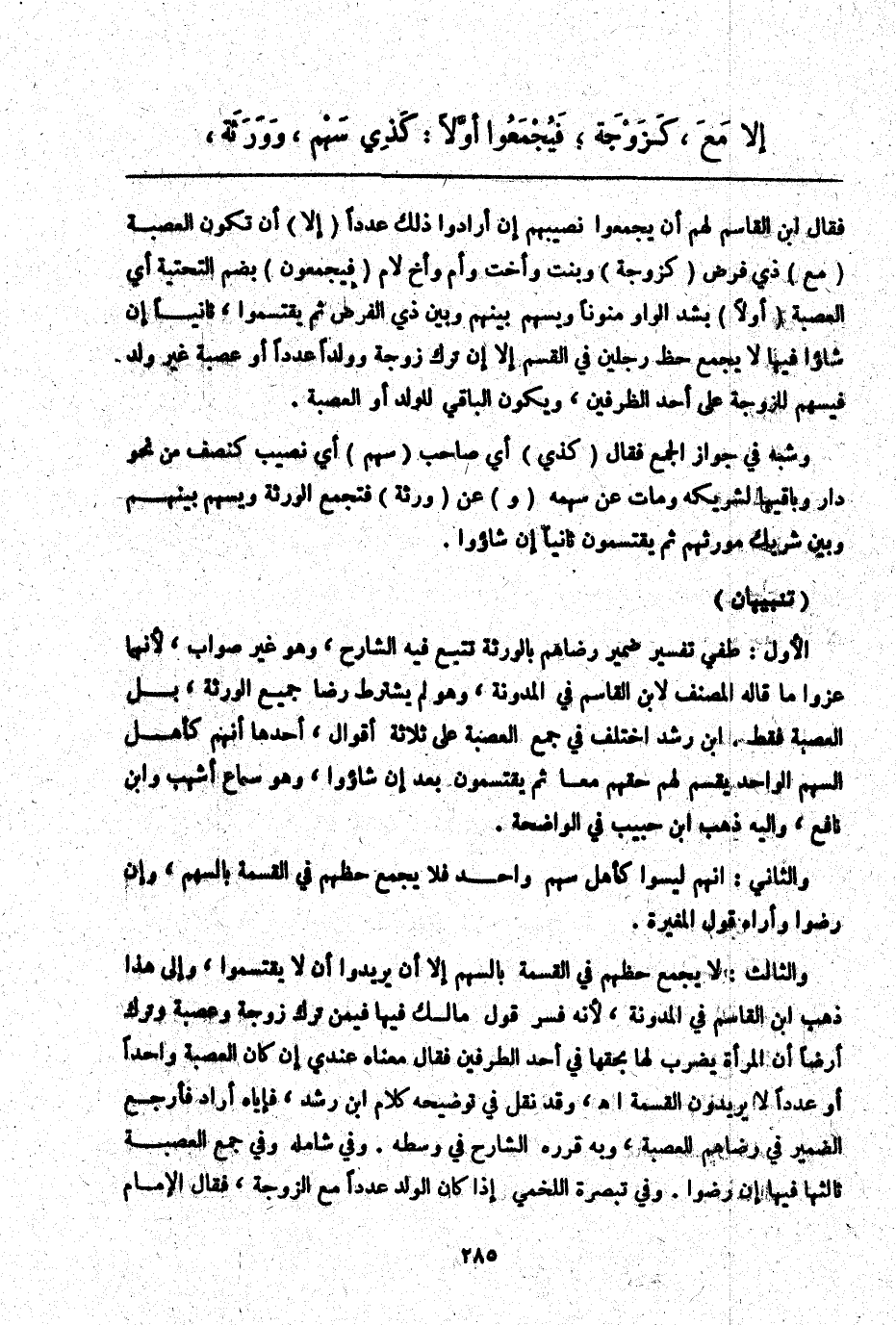 ـــــــــــــــــــــــــــــQفَقَالَ ابْنُ الْقَاسِمِ لَهُمْ أَنْ يَجْمَعُوا نَصِيبَهُمْ إنْ أَرَادُوا ذَلِكَ عَدَدًا (إلَّا) أَنْ تَكُونَ الْعَصَبَةُ (مَعَ) ذِي فَرْضٍ (كَزَوْجَةٍ) وَبِنْتٍ وَأُخْتٍ وَأُمٍّ وَأَخٍ لِأُمٍّ (فَيُجْمَعُونَ) بِضَمِّ التَّحْتِيَّةِ أَيْ الْعَصَبَةُ (أَوَّلًا) بِشَدِّ الْوَاوِ مُنَوَّنًا وَيُسْهَمُ بَيْنَهُمْ وَبَيْنَ ذِي الْفَرْضِ ثُمَّ يَقْتَسِمُونَ ثَانِيًا إنْ شَاءُوا فِيهَا لَا يُجْمَعُ حَظُّ رَجُلَيْنِ فِي الْقَسْمِ إلَّا إنْ تَرَكَ زَوْجَةً وَوَلَدًا عَدَدًا أَوْ عَصَبَةً غَيْرَ وَلَدٍ فَيُسْهَمُ لِلزَّوْجَةِ عَلَى أَحَدِ الطَّرَفَيْنِ، وَيَكُونُ الْبَاقِي لِلْوَلَدِ أَوْ الْعَصَبَةِ. وَشَبَّهَ فِي جَوَازِ الْجَمْعِ فَقَالَ (كَذِي) أَيْ صَاحِبِ (سَهْمٍ) أَيْ نَصِيبٍ كَنِصْفٍ مِنْ نَحْوِ دَارٍ وَبَاقِيهَا لِشَرِيكِهِ وَمَاتَ عَنْ سَهْمِهِ (وَ) عَنْ (وَرَثَةٍ) فَتُجْمَعُ الْوَرَثَةُ وَيُسْهَمُ بَيْنَهُمْ وَبَيْنَ شَرِيكِ مُوَرِّثِهِمْ ثُمَّ يَقْتَسِمُونَ ثَانِيًا إنْ شَاءُوا.