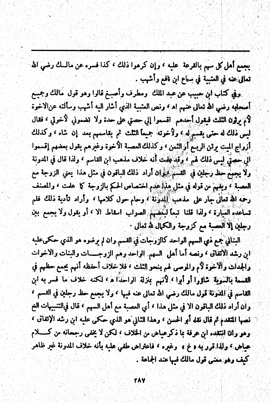 وَنَصُّ الْعُتْبِيَّةِ الَّذِي أَشَارَ إلَيْهِ أَشْهَبُ وَسَأَلْته عَنْ الْإِخْوَةِ لِأُمٍّ يَرِثُونَ الثُّلُثَ فَيَقُولُ أَحَدُهُمْ اقْسِمُوا إلَيَّ حِصَّتِي عَلَى حِدَةٍ وَلَا تَضُمُّونِي لِإِخْوَتِي، فَقَالَ لَيْسَ ذَلِكَ لَهُ حَتَّى يُقْسَمَ لَهُ، وَلِإِخْوَتِهِ جَمِيعًا الثُّلُثُ ثُمَّ يُقَاسِمُهُمْ بَعْدُ إنْ شَاءَ، وَكَذَلِكَ أَزْوَاجُ الْمَيِّتِ يَرِثْنَ الرُّبْعَ أَوْ الثُّمُنَ، وَكَذَلِكَ الْعَصَبَةُ الْإِخْوَةُ وَغَيْرُهُمْ يَقُولُ بَعْضُهُمْ اقْسِمُوا إلَيَّ حِصَّتِي لَيْسَ ذَلِكَ لَهُمْ، وَقَدْ عَلِمْت أَنَّهُ خِلَافُ مَذْهَبِ ابْنِ الْقَاسِمِ، وَلِذَا قَالَ فِي الْمُدَوَّنَةِ وَلَا يُجْمَعُ حَظُّ رَجُلَيْنِ فِي الْقَسْمِ، وَإِنْ أَرَادَ ذَلِكَ الْبَاقُونَ فِي مِثْلِ هَذَا يَعْنِي الزَّوْجَةَ مَعَ الْعَصَبَةِ، وَيُفْهَمُ مِنْ قَوْلِهِ فِي مِثْلِ هَذَا عَدَمُ اخْتِصَاصِ الْحُكْمِ بِالزَّوْجَةِ كَمَا عَلِمْت وَالْمُصَنِّفُ - رَحِمَهُ اللَّهُ تَعَالَى - جَارٍ عَلَى مَذْهَبِ الْمُدَوَّنَةِ، وَحَامَ حَوْلَ كَلَامِهَا، وَأَرَادَ تَأْدِيَةَ ذَلِكَ فَلَمْ تُسَاعِدْهُ الْعِبَارَةُ، وَلِذَا قُلْنَا تَبَعًا لِبَعْضِهِمْ الصَّوَابُ إسْقَاطُ إلَّا، أَوْ يَقُولُ وَلَا يُجْمَعُ بَيْنَ رَجُلَيْنِ إلَّا الْعَصَبَةُ مَعَ كَزَوْجَةٍ وَالْكَمَالُ لِلَّهِ تَعَالَى. الْبُنَانِيُّ جَمْعُ ذِي السَّهْمِ الْوَاحِدِ كَالزَّوْجَاتِ فِي الْقَسْمِ وَإِنْ لَمْ يَرْضَوْهُ هُوَ الَّذِي حَكَى عَلَيْهِ ابْنُ رُشْدٍ الِاتِّفَاقَ، وَنَصُّهُ أَمَّا أَهْلُ السَّهْمِ الْوَاحِدِ وَهُمْ الزَّوْجَاتُ وَالْبَنَاتُ وَالْأَخَوَاتُ وَالْجَدَّاتُ وَالْإِخْوَةُ لِأُمٍّ وَالْمُوصَى لَهُمْ بِنَحْوِ الثُّلُثِ، فَلَا خِلَافَ أَحْفَظُهُ أَنَّهُمْ يُجْمَعُ حَظُّهُمْ فِي الْقِسْمَةِ بِالسَّوِيَّةِ شَاءُوا أَوْ أَبَوْا؛ لِأَنَّهُمْ بِمَنْزِلَةِ الْوَاحِدِ. اهـ.