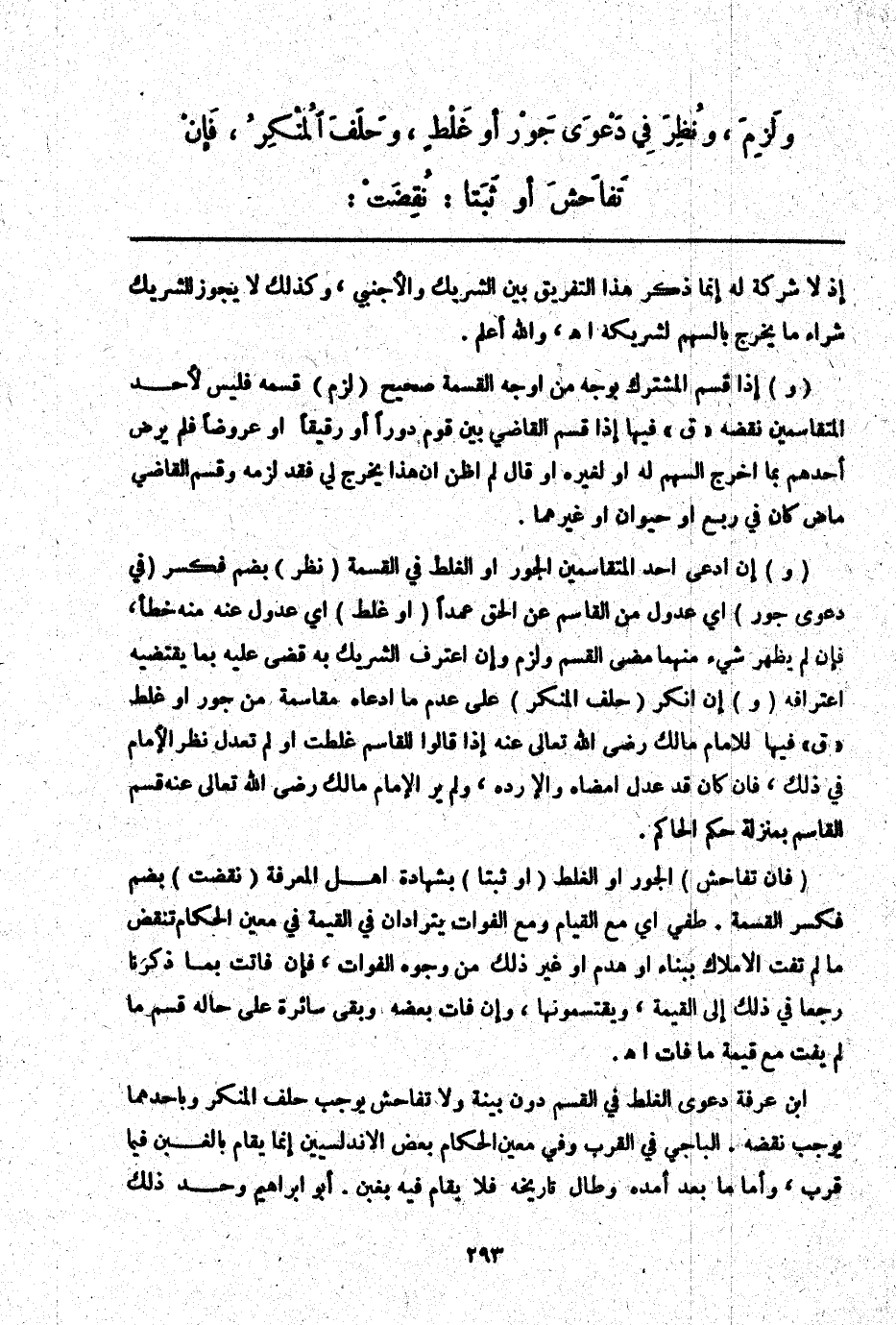 ابْنُ عَرَفَةَ دَعْوَى الْغَلَطِ فِي الْقَسْمِ دُونَ بَيِّنَةٍ وَلَا تَفَاحُشٍ يُوجِبُ حَلِفَ الْمُنْكِرِ وَبِأَحَدِهِمَا يُوجِبُ نَقْضَهُ. الْبَاجِيَّ فِي الْقُرْبِ وَفِي مُعِينِ الْحُكَّامِ بَعْضُ الْأَنْدَلُسِيِّينَ إنَّمَا يُقَامُ بِالْغَبْنِ فِيمَا قَرُبَ، وَأَمَّا مَا بَعُدَ أَمَدُهُ وَطَالَ تَارِيخُهُ فَلَا يُقَامُ فِيهِ بِغَبْنٍ. أَبُو إبْرَاهِيمَ وَحَدُّ ذَلِكَ
